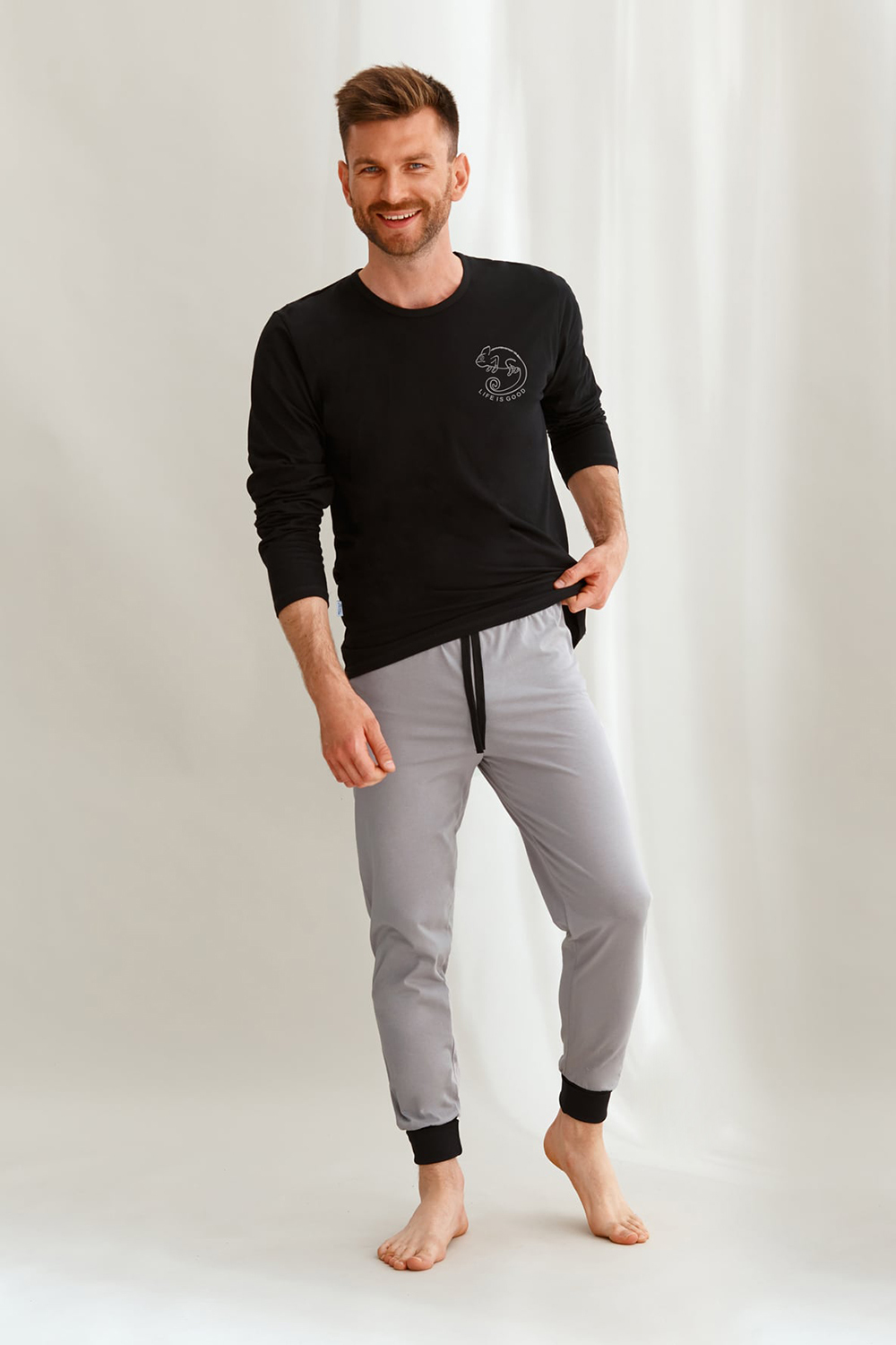 Стильная мужская пижама Jacob. Пижама выполнена из качественного и мягкого хлопка, состоит из футболки черного цвета и серых брюк. Футболка с длинными рукавами и круглым вырезом горла, брюки с мягкой резинкой в поясе, по ширине регулируются черным внутренним шнурком, внизу на манжетах черного цвета. На груди слева футболка украшена контурным принтом хамелеона и надписью "Life is good". Пижама очень комфортная и удобная, будет отличной домашней одеждой и замечательным подарком для близких людей.