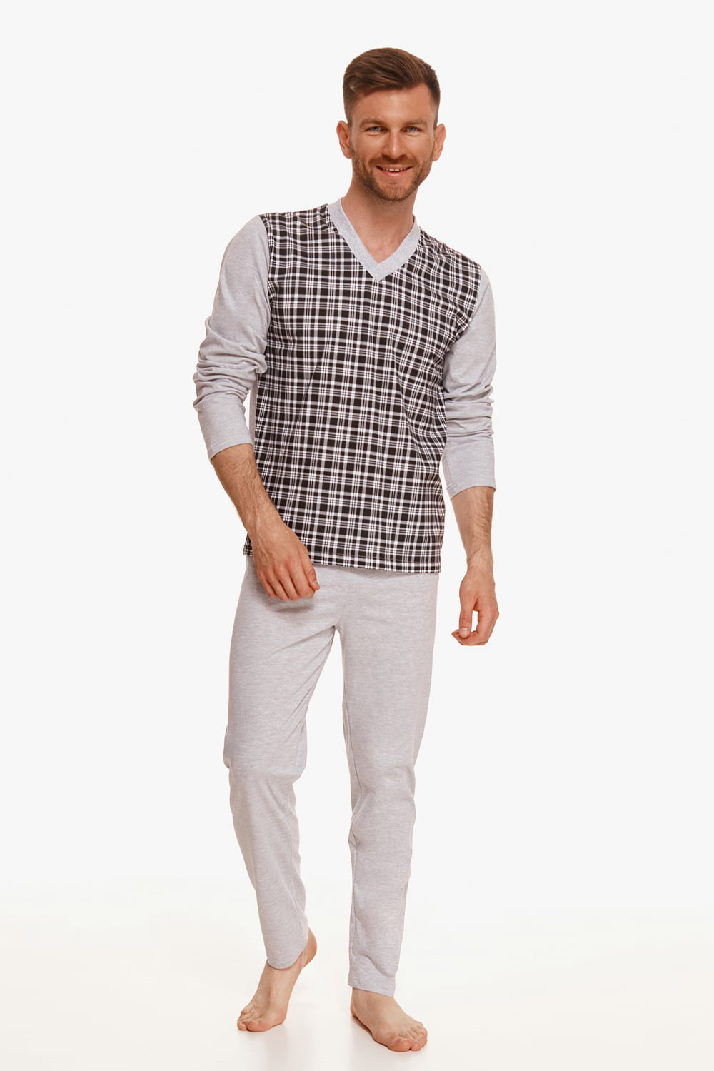 Стильная мужская пижама Victor. Пижама состоит из клетчатого лонгслива и однотонных брюк. Логнслив свободного кроя с длинными рукавами и V-образным вырезом горловины. Брюки на широкой мягкой резинке. Пижама идеально подходит для сна и в качестве домашнего костюма.