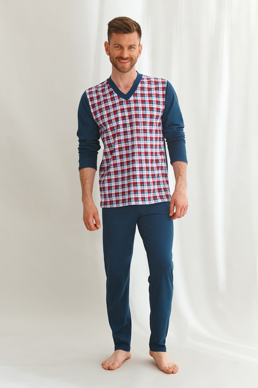 Стильная мужская пижама Victor. Пижама состоит из клетчатого лонгслива и однотонных брюк. Логнслив свободного кроя с длинными рукавами и V-образным вырезом горловины. Брюки на широкой мягкой резинке. Пижама идеально подходит для сна и в качестве домашнего костюма.
