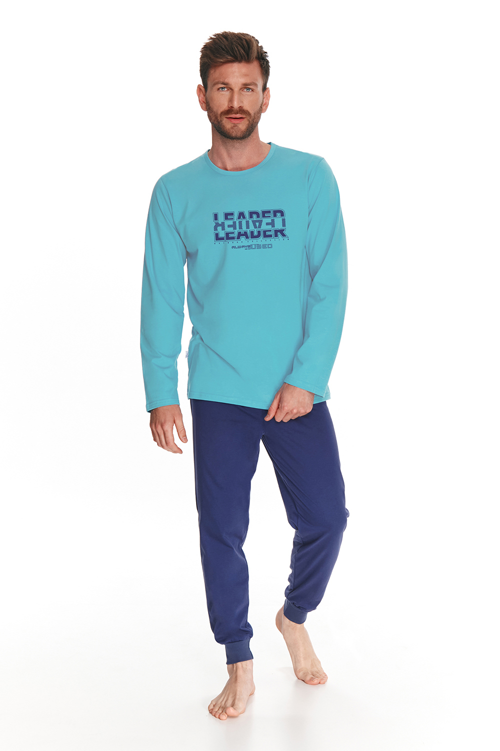 Стильная мужская пижама Jacob. Пижама выполнена из качественного и мягкого хлопка, состоит из футболки бирюзового цвета и темно-синих брюк. Футболка с длинными рукавами и круглым вырезом горла, брюки с мягкой резинкой в поясе, по ширине регулируются черным внутренним шнурком, внизу на манжетах. На груди слева футболка украшена принтом. Пижама очень комфортная и удобная, будет отличной домашней одеждой и замечательным подарком для близких людей.