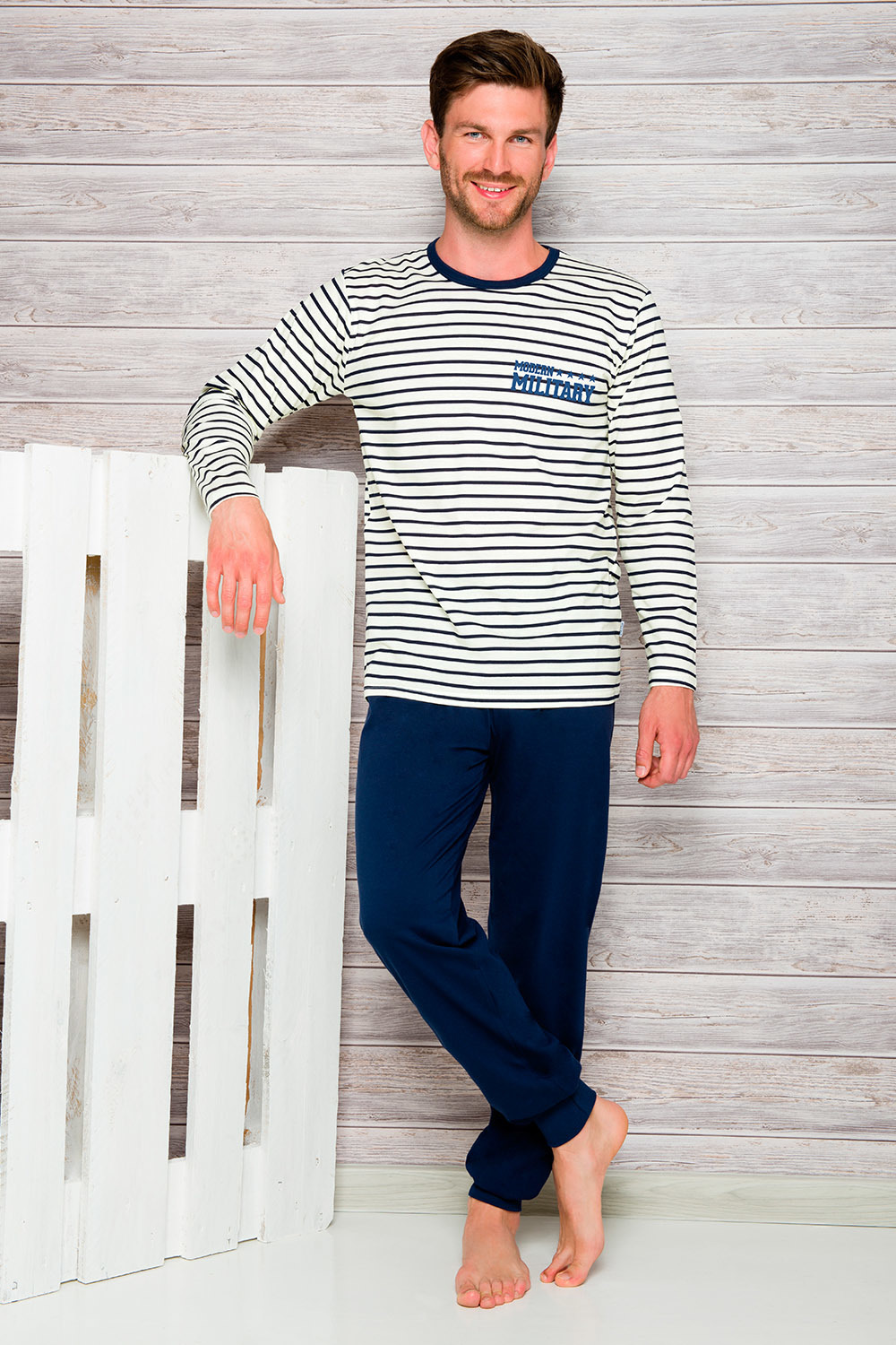 Полосатый лонгслив цвета экрю с темно-синим + темно-синие штаны Max