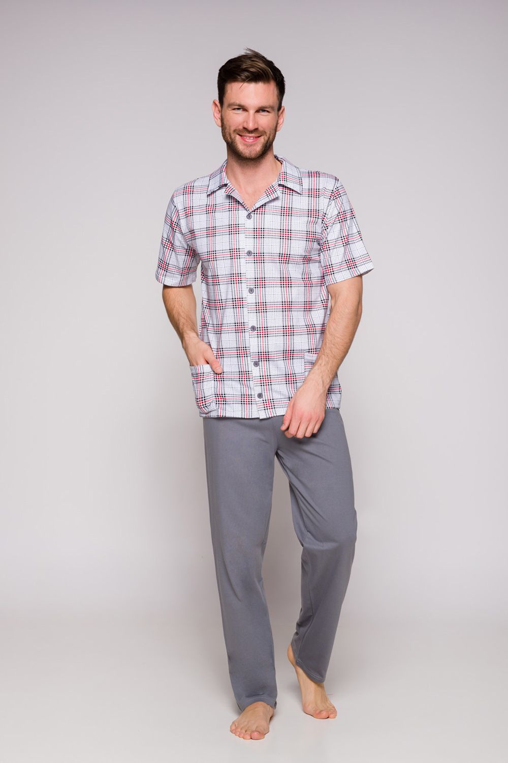 Мужская хлопковая пижама Gracjan состоит из рубашки с коротким рукавом и штанов синего цвета. Рубашка голубого цвета, на пуговицах и с карманами, декорирована принтом в виде стрелок.