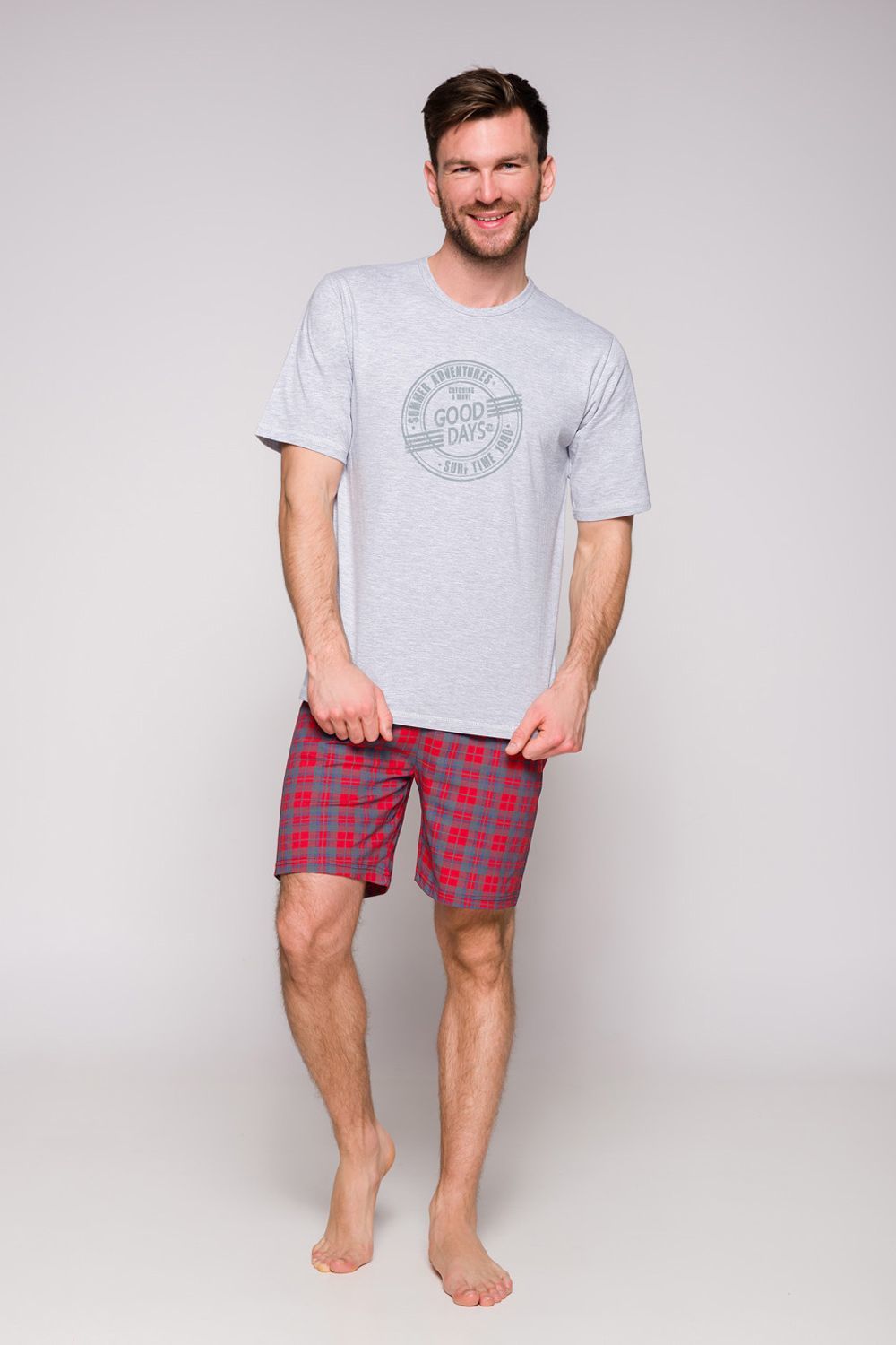 Мужская пижама Nikodem состоит из футболки серого цвета и красных клетчатых шорт. Футболка с коротким рукавом, декорирована принтом в виде надписи на груди.
