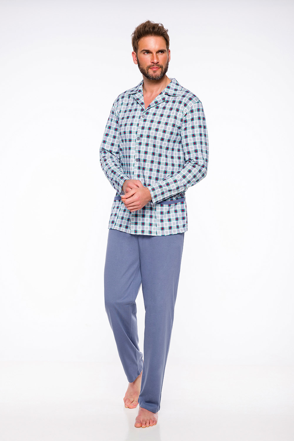 Мужская хлопковая пижама Gracjan состоит из клетчатой рубашки и однотонных прямых брюк. Рубашка свободного кроя, с длинным рукавом и накладными карманами. Пижама идеально подходит для сна и в качестве домашнего костюма.