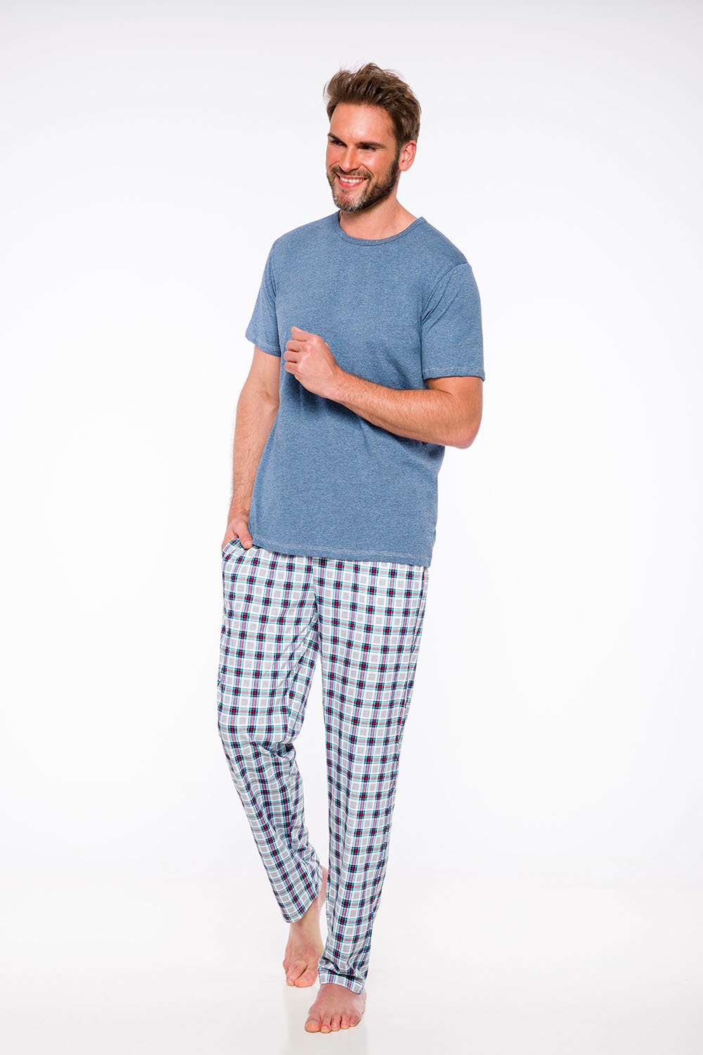 Мужская хлопковая пижама Jeremi состоит из футболки синего цвета и клетчатых брюк. Футболка свободного кроя, с круглым вырезом горловины. Брюки прямые с карманами. Пижама идеально подходит для сна и в качестве домашнего костюма.