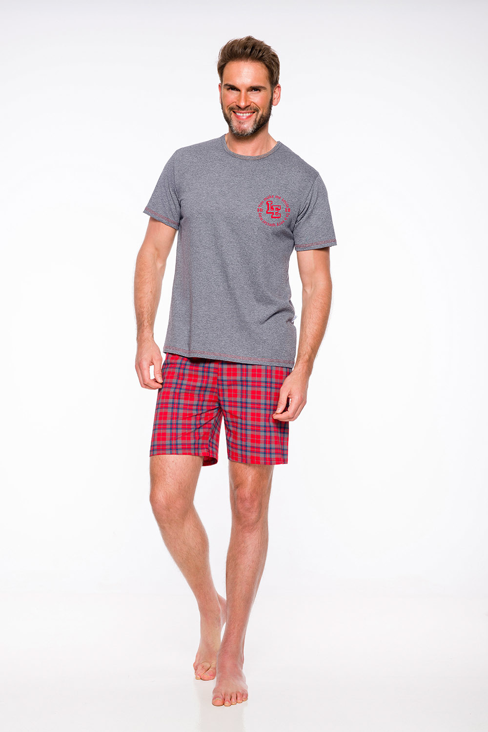 Мужская хлопковая пижама Nikodem состоит из футболки серого цвета и клетчатых шорт. Футболка свободного кроя, с коротким рукавом, слева на груди принт. Пижама идеально подходит для сна и в качестве домашнего костюма.