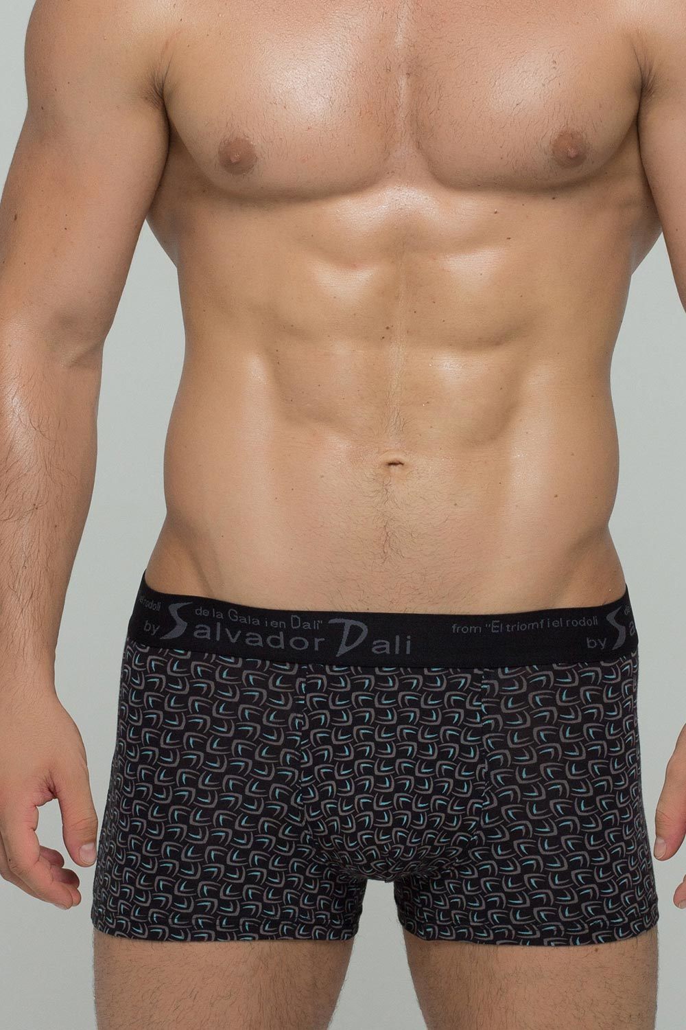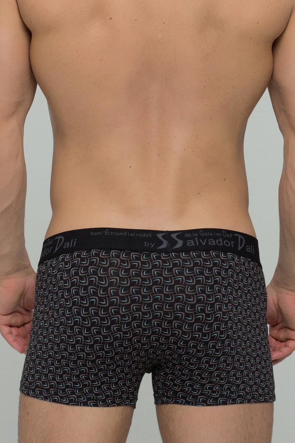 Мужские обтягивающие трусы-боксеры 2023 черного цвета с гладкими внутренними швами, основа хлопковая. Пояс на широкой резинке с надписью "Salvador Dali" по кругу. Трусы идеально облегают тело и пригодны для носки с узкими видами джинс и штанов.