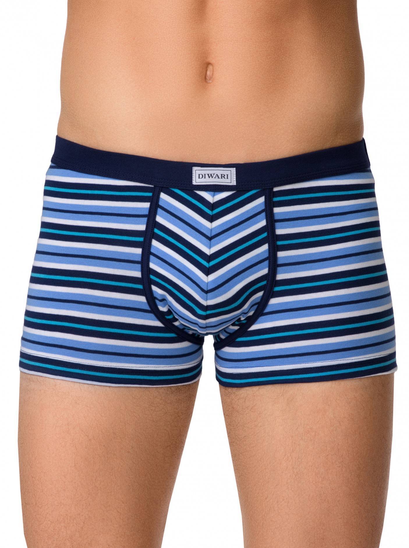 Мужские трусы шорты облегающего кроя из набивного трикотажного полотна с рисунком в широкую полоску. Клин с однотонным кантом по переду изделия. Пояс обработан эластичной тесьмой , окантованной однотонной широкой бейкой.