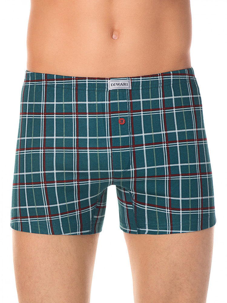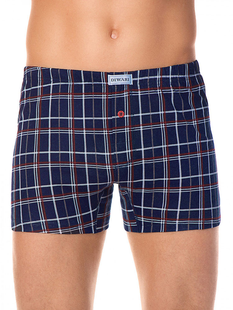 Мужские трусы боксеры из эластичного трикотажного полотна в крупную клетку. Имитация гульфика с одной пуговицей. Пояс обработан эластичной тесьмой швом в подгибку.