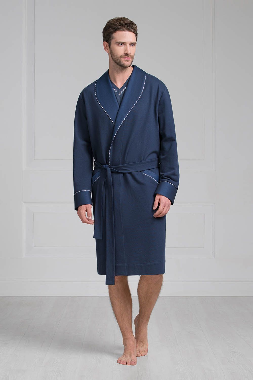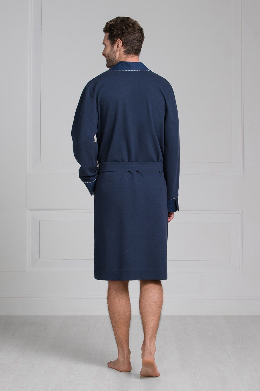 Классический мужской средней длины из плотной, хлопчатобумажной ткани тёмно-синего цвета. Модель на запахе, с отложным воротником. Манжеты рукавов, часть накладных карманов, а также отложной воротник выполнены из фактурной ткани коричневого цвета, а также декорированы тонким кантом из контрастной ткани. Глубокие накладные карманы добавляют модели функциональности. Длинный, съемный пояс подчеркивает силуэт. Натуральная ткань делает эту модель отличным вариантом для любого времени года. Практичная модель для домашнего комфорта для мужчин, ценящих классический стиль.