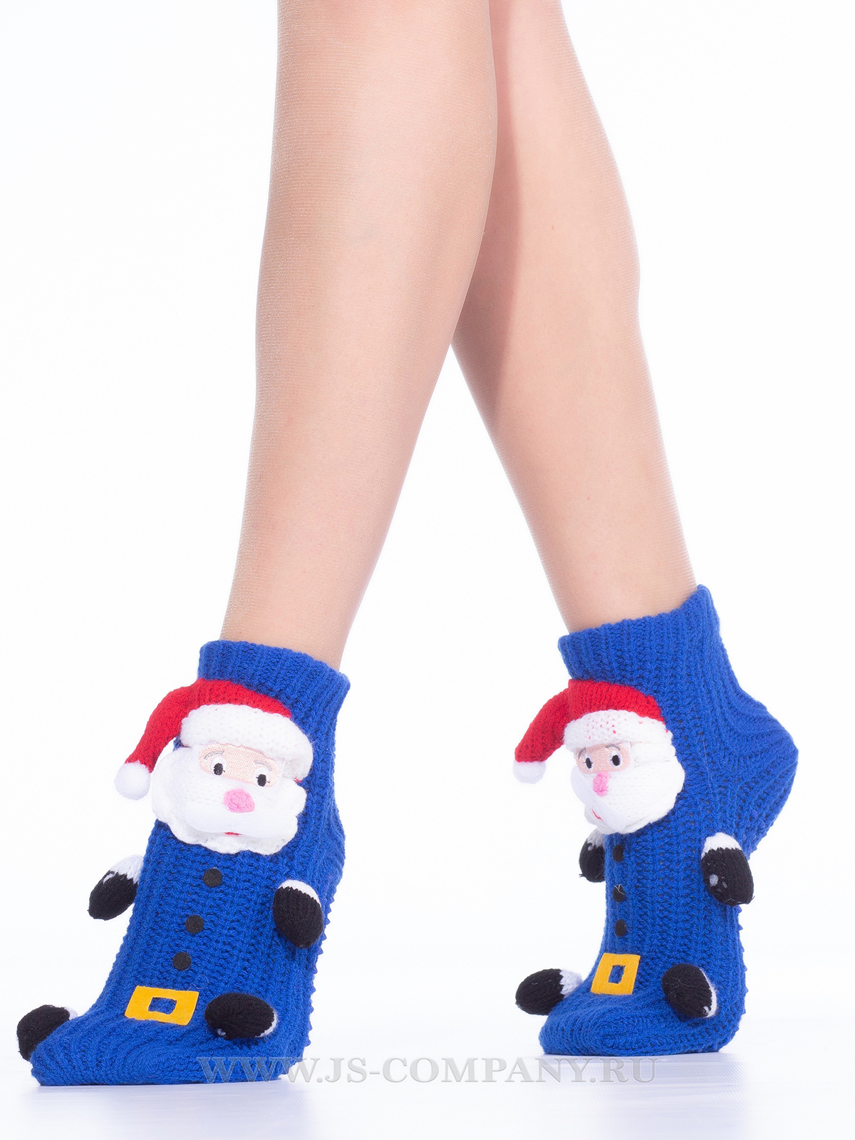 Вязаные женские носки с широкой комфортной резинкой и антискользящим покрытием на подошве. На фронтальной части модели размещена объемная игрушка-аппликация в виде Деда Мороза.