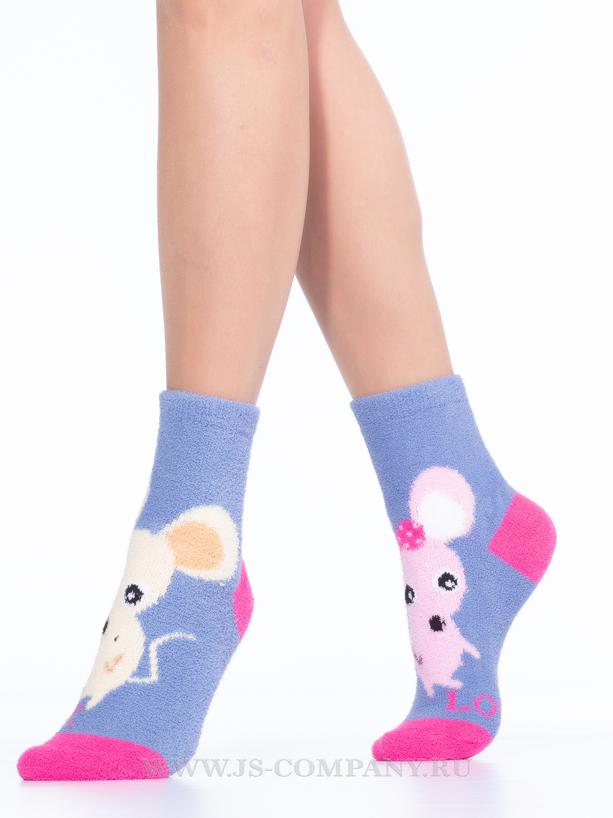 Махровые женские носки с широкой комфортной резинкой. Фронтальная часть модели украшена ярким рисунком "влюбленные мышки".