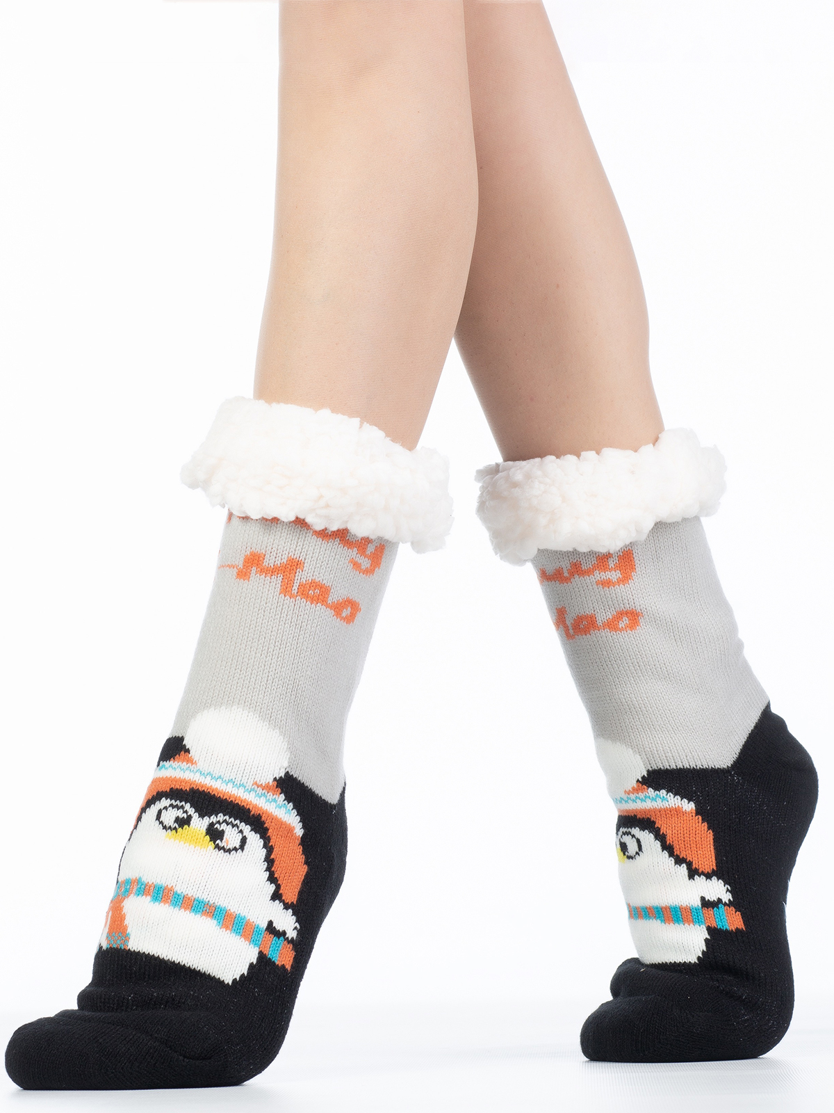 Теплые женские носки с искусственным мехом внутри и резинкой с отворотом. Фронтальная часть модели украшена ярким рисунком "пингвин в шапочке".