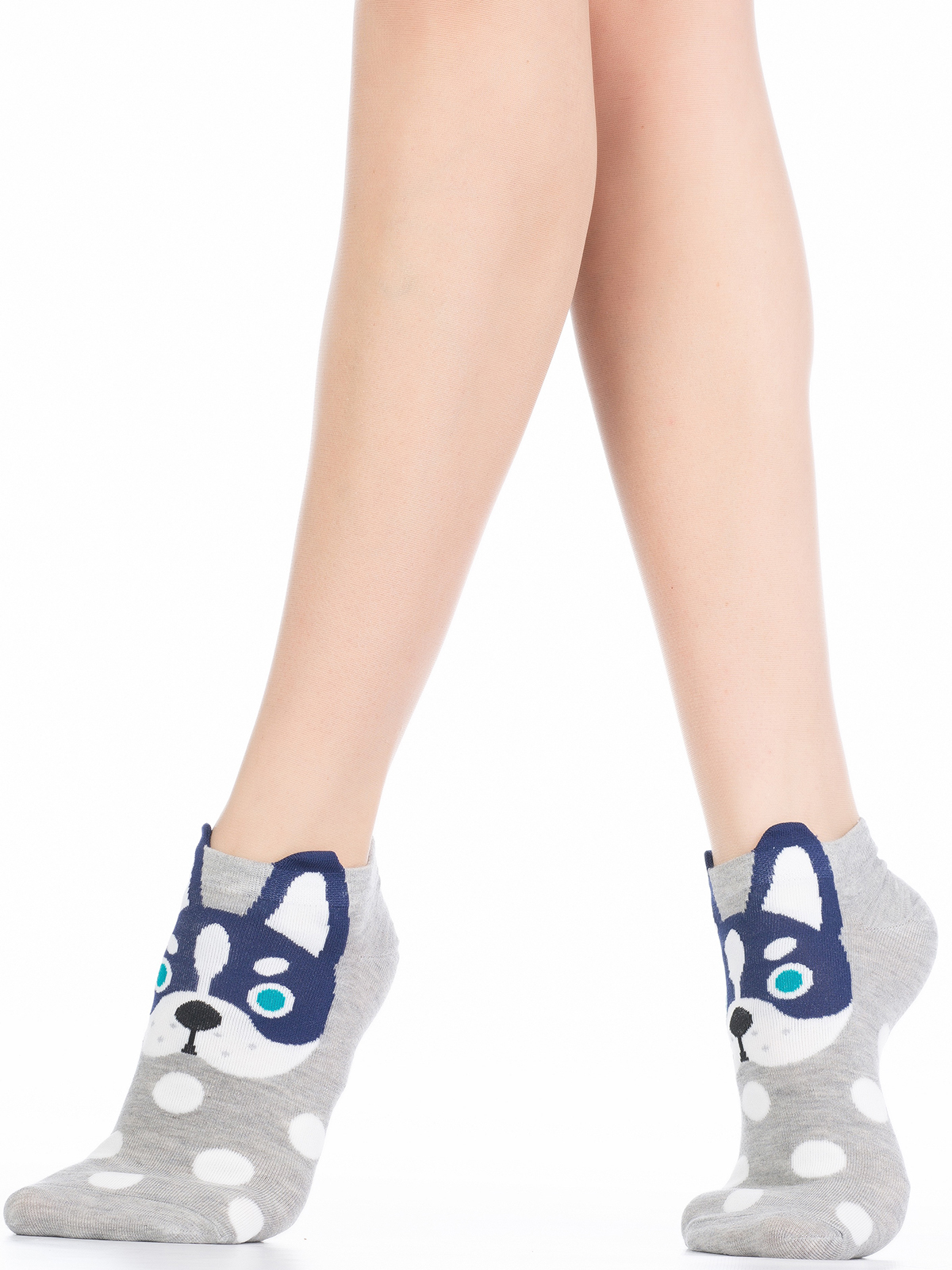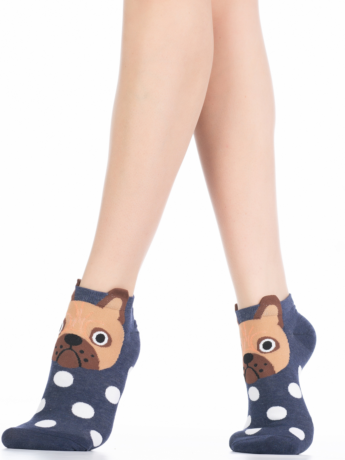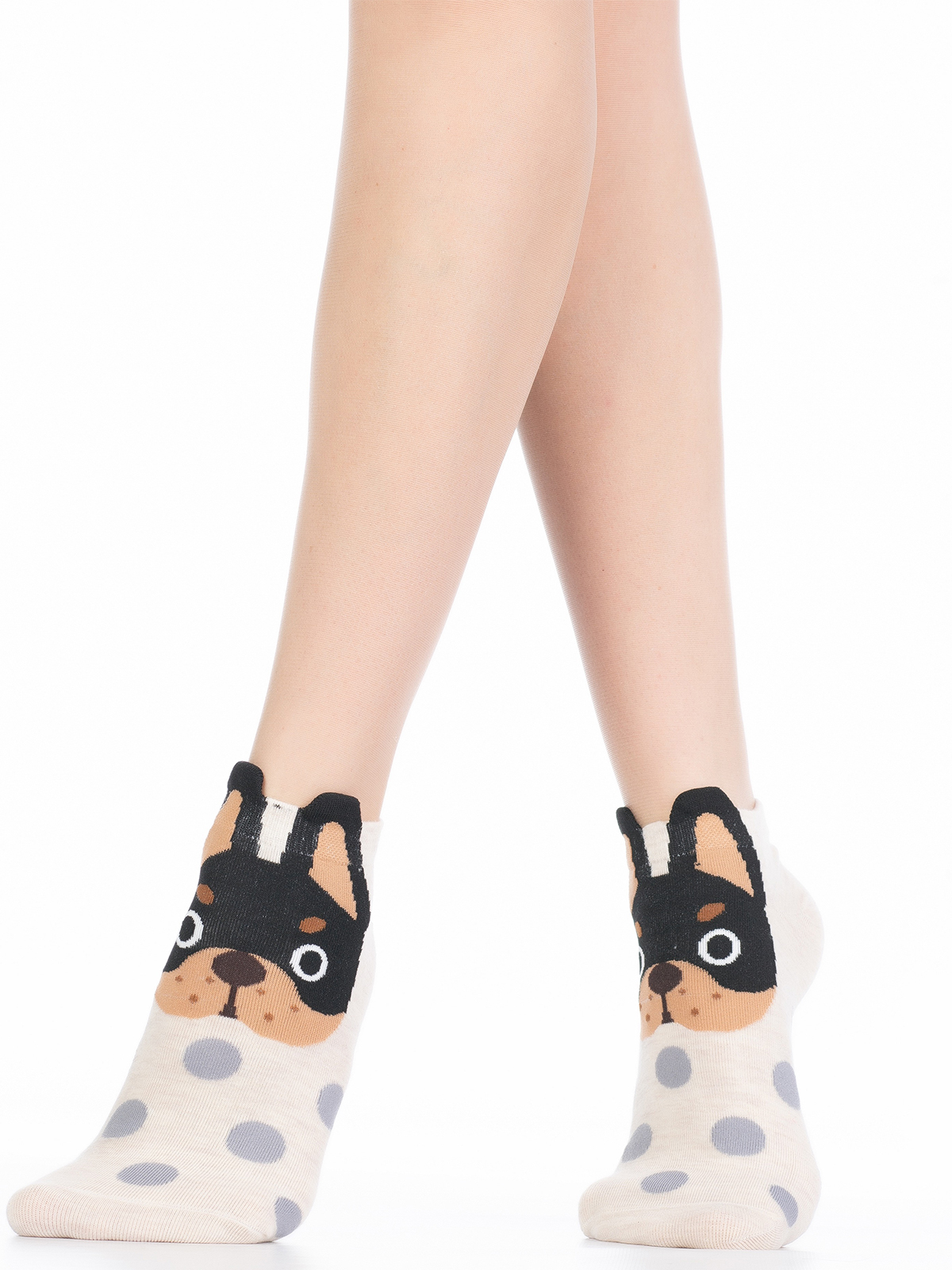 Укороченные женские носки из хлопка с эластаном, с комфортной резинкой. Фронтальная часть модели украшена разноцветным принтом "собачки", по всей длине рисунок "крупный горошек".