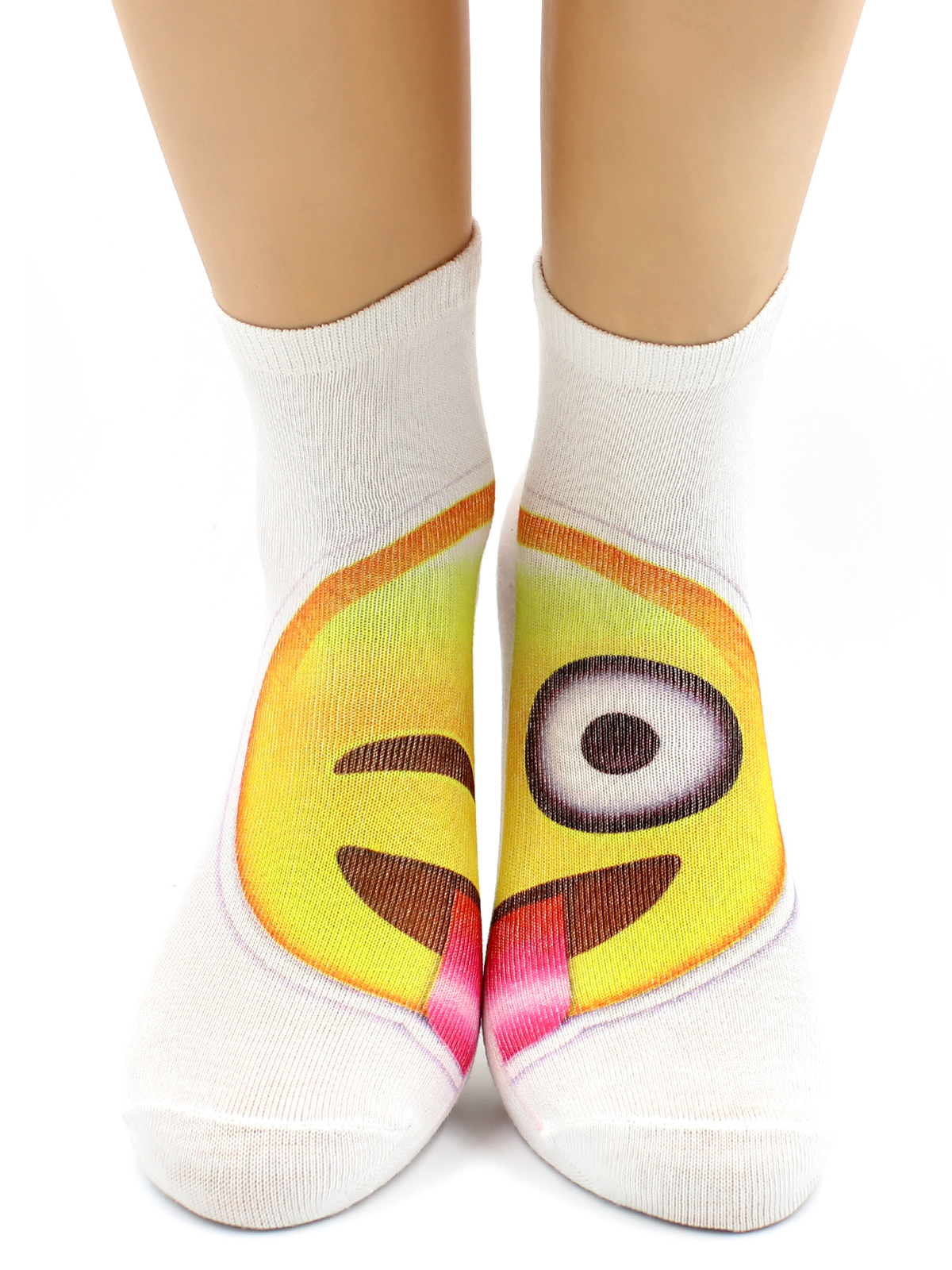 Укороченные женские носки из хлопка с эластаном, с комфортной резинкой. На фронтальной части модели размещен яркий рисунок "крупный смайлик из половинок".