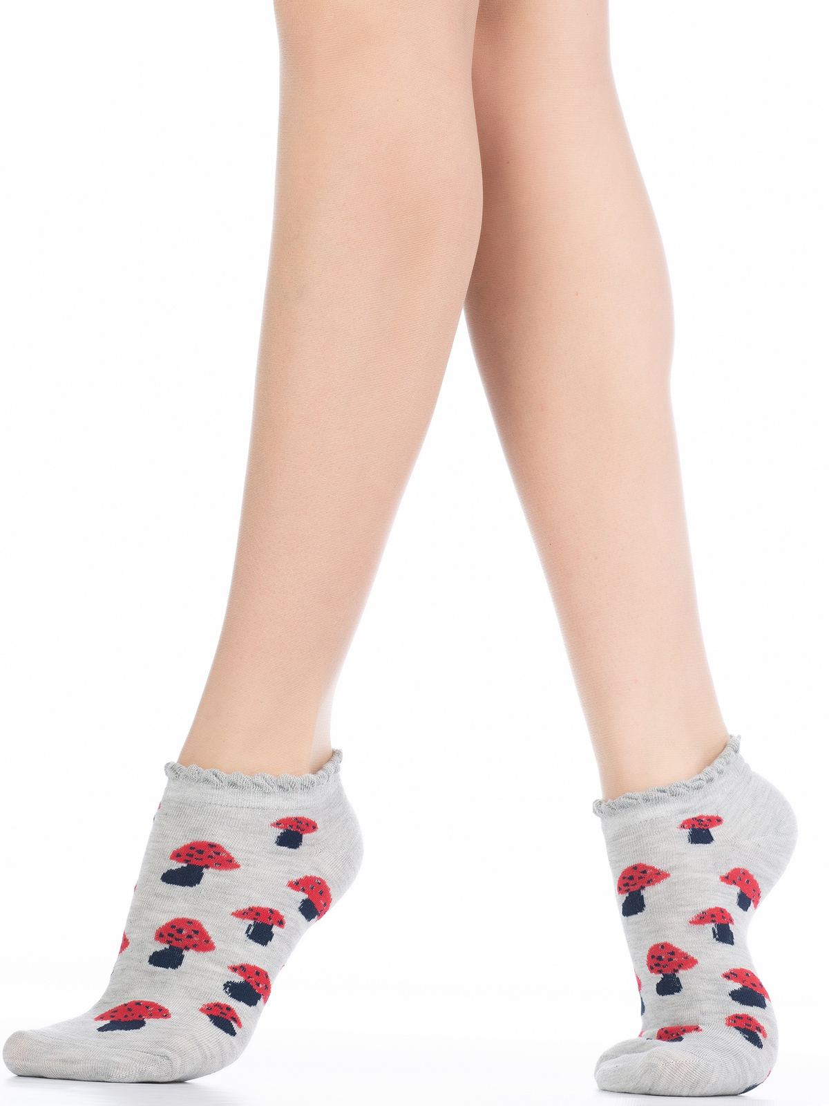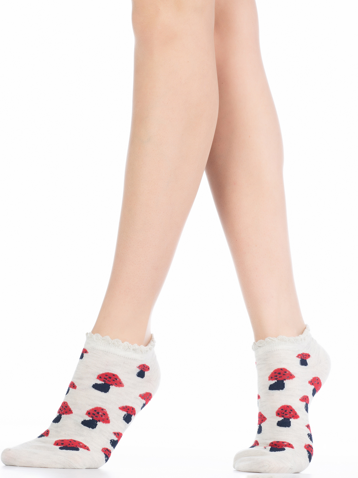 Укороченные женские носки из хлопка с эластаном, с комфортной узкой резинкой. Модель украшена ярким рисунком в виде грибочков.