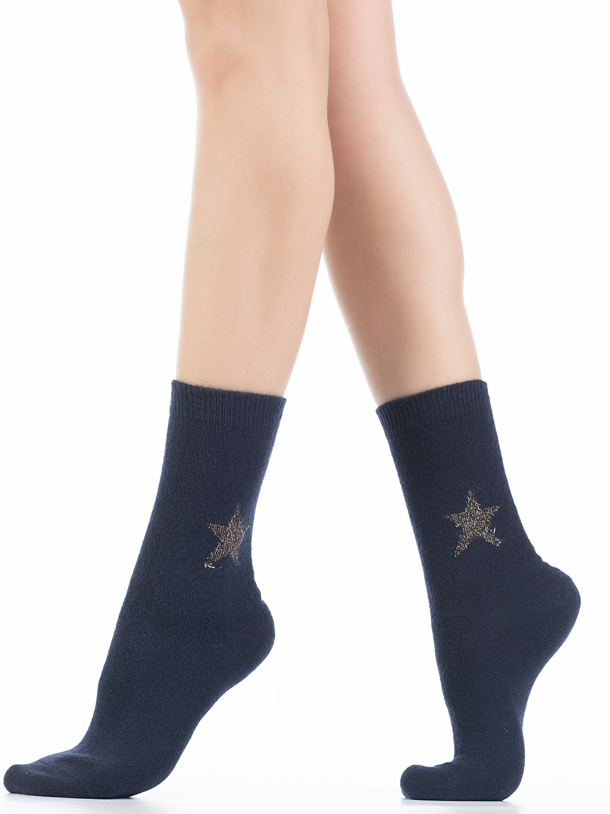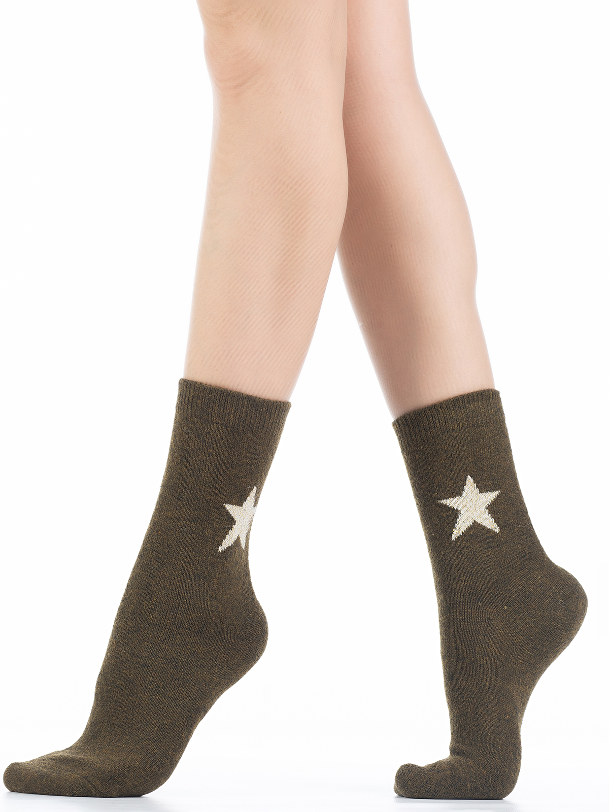 Теплые женские носки с широкой комфортной резинкой, выполненные из шерсти и ангоры. Боковая часть модели украшена контрастным рисунком с блестящим люрексом в виде звездочки.