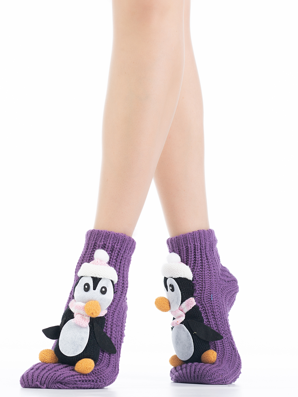 Вязаные женские носки с широкой комфортной резинкой и антискользящим покрытием на подошве. На фронтальной части модели размещена объемная игрушка-аппликация в виде пингвина.