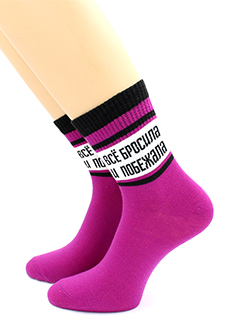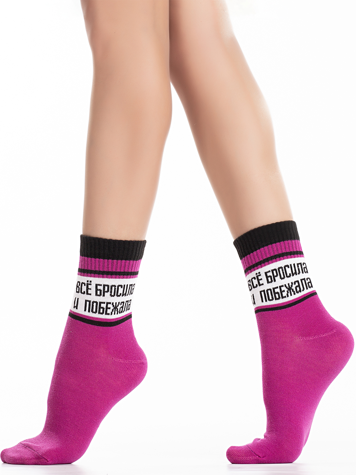 Хлопковые женские носки с комфортной широкой резинкой "в рубчик". Под резинкой модели размещена яркая надпись "Всё бросила и побежала" в обрамлении контрастных полосок.