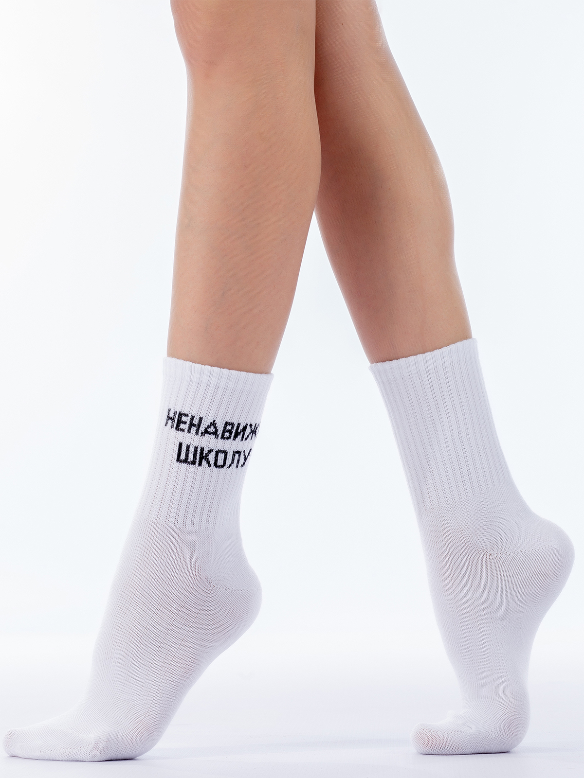 Хлопковые носки унисекс с комфортной широкой резинкой "в рубчик". На боковой части резинки модели размещена контрастная надпись "Ненавижу школу".