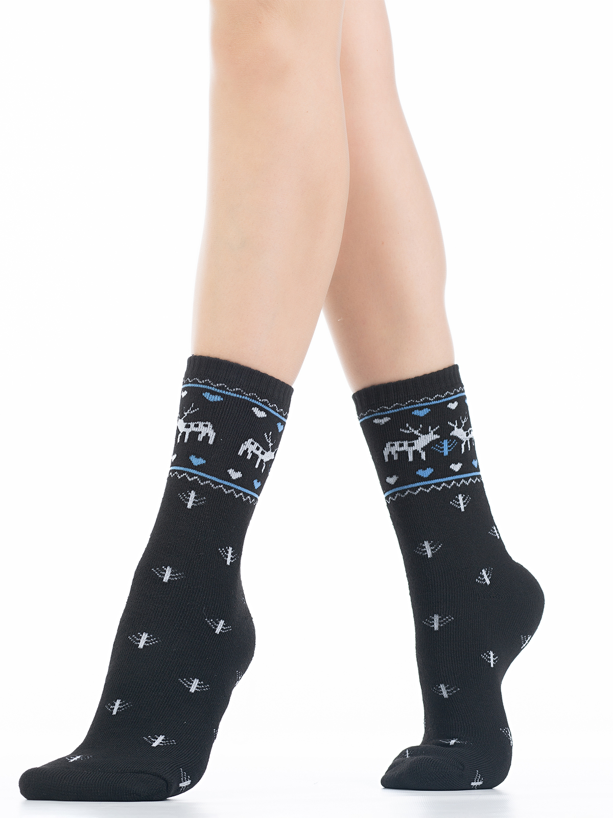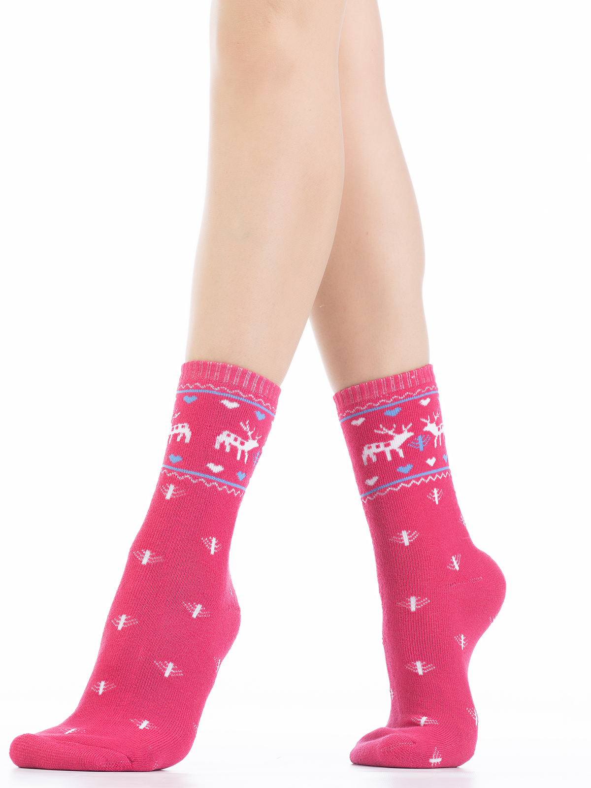Теплые женские носки из шерсти и ангоры, изнутри махровые, с широкой комфортной резинкой. Модель украшена ярким новогодним орнаментом "елочки и олени".
