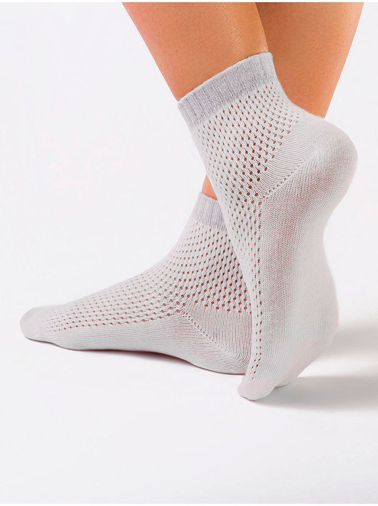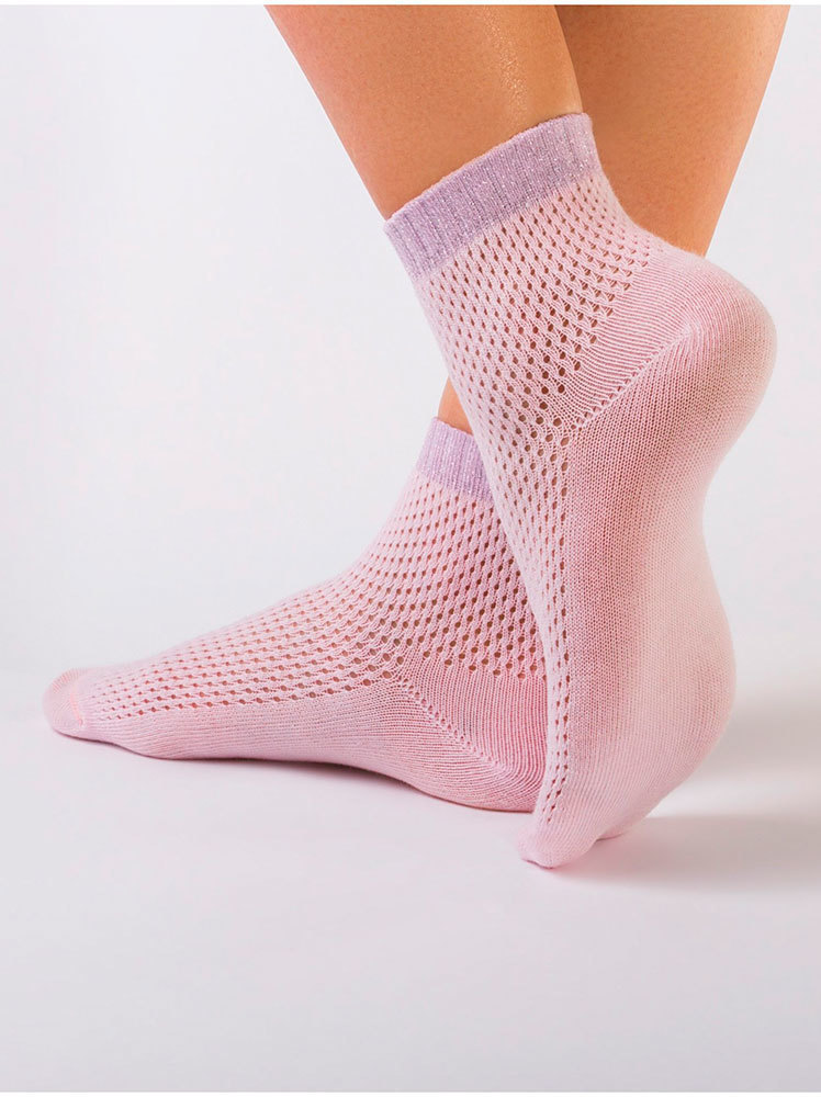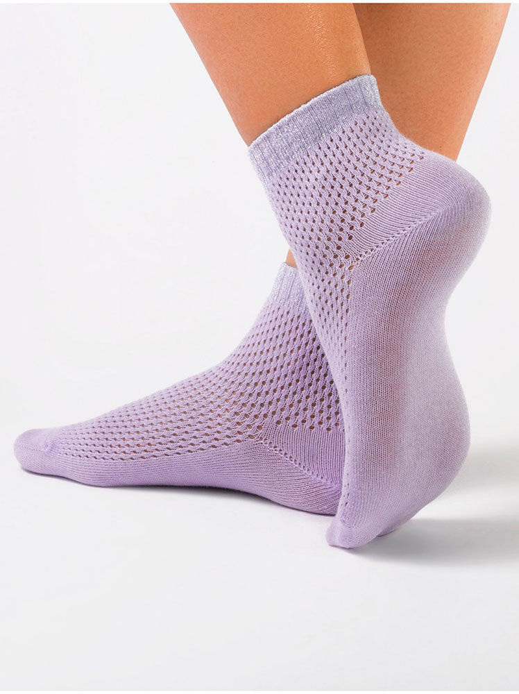 Укороченные женские ажурные хлопковые носки с комфортной резинкой, украшенной люрексной ниткой, укрепленной стопой и полупрозрачным ажурным плетением по верху.