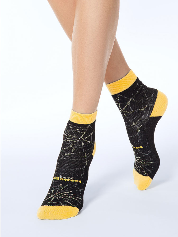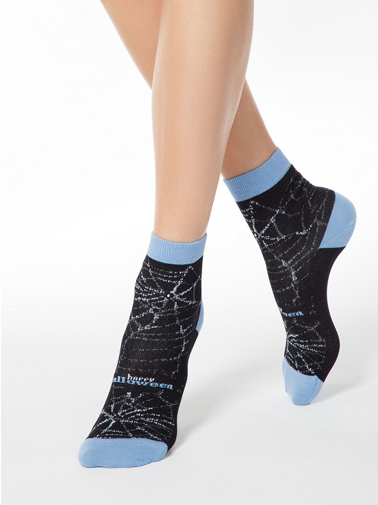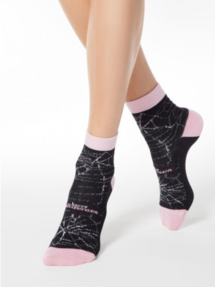 Женские хлопковые носки с комфортной резинкой и разнообразными рисунками, украшенными стразами и блестящей люрексной нитью.