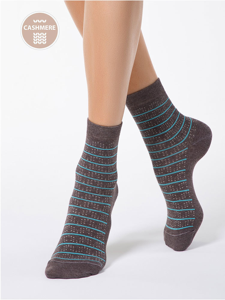 Комфортные теплые женские носки из вискозного волокна в сочетании кашемиром и рисунком в виде вывязанных горизонтальных полос.