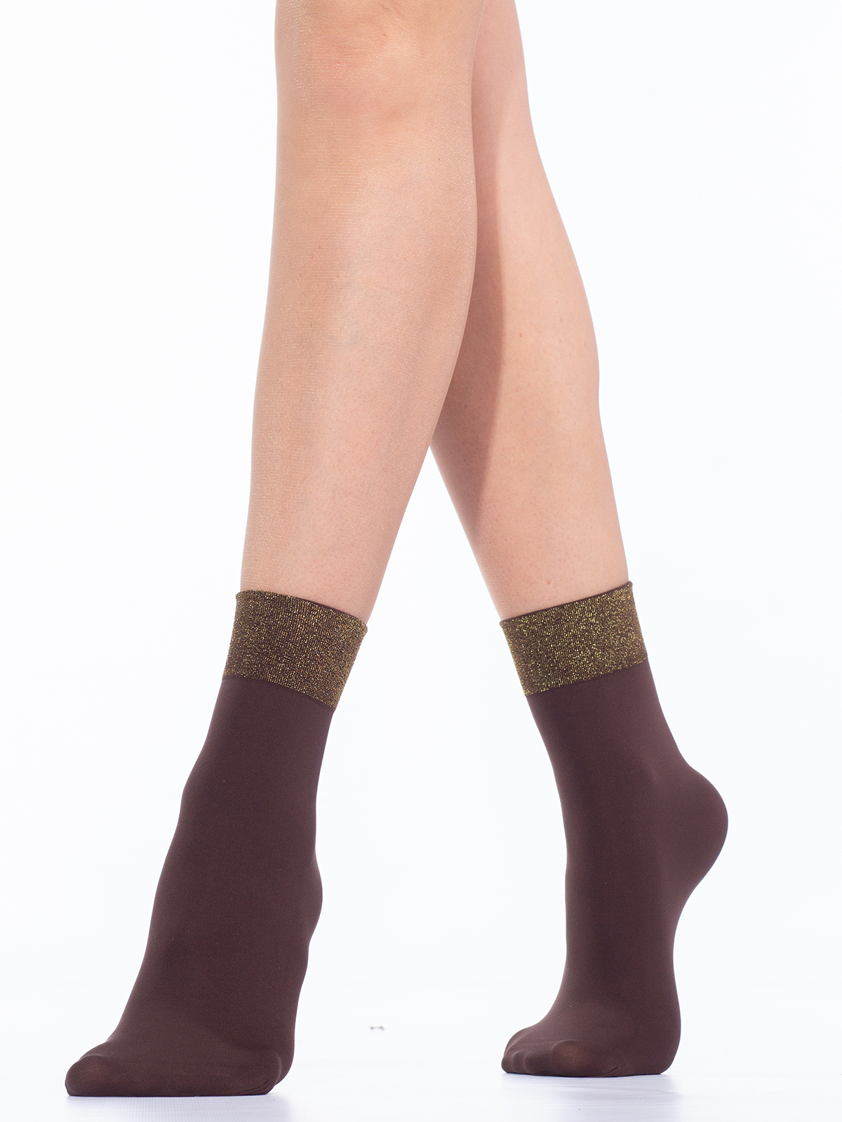 Непрозрачные эластичные носки с укрепленным мысом, выполненные из микрофибры с вкраплениями блестящей люрексовой нити на резинке.