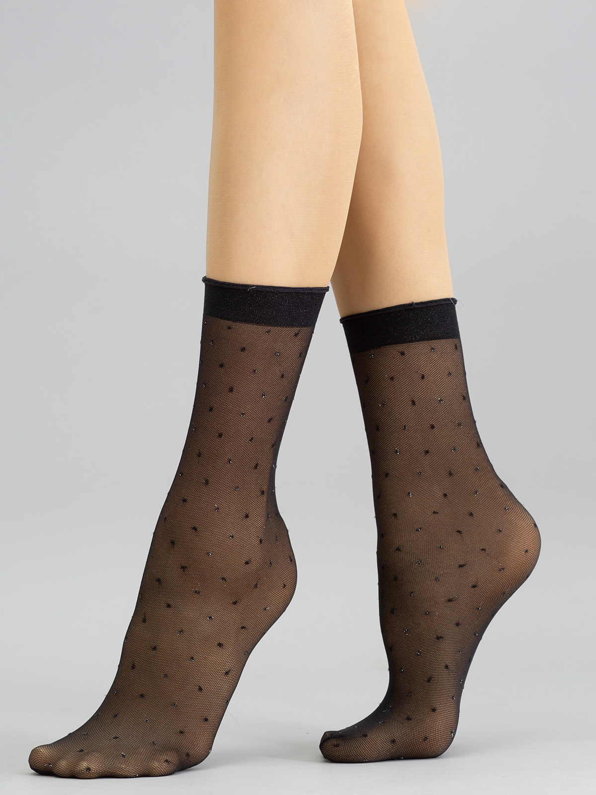 Тонкие фантазийные женские носки плотностью 20 ден с эффектом тюля (микросеточка на основе) и тканым узором в мелкий горошек. Удобная резинка с блестящими люрексовыми вкраплениями, обеспечивающия оптимальную посадку и идеальное прилегание без передавливания. Невидимый мысок для максимальной элегантности.