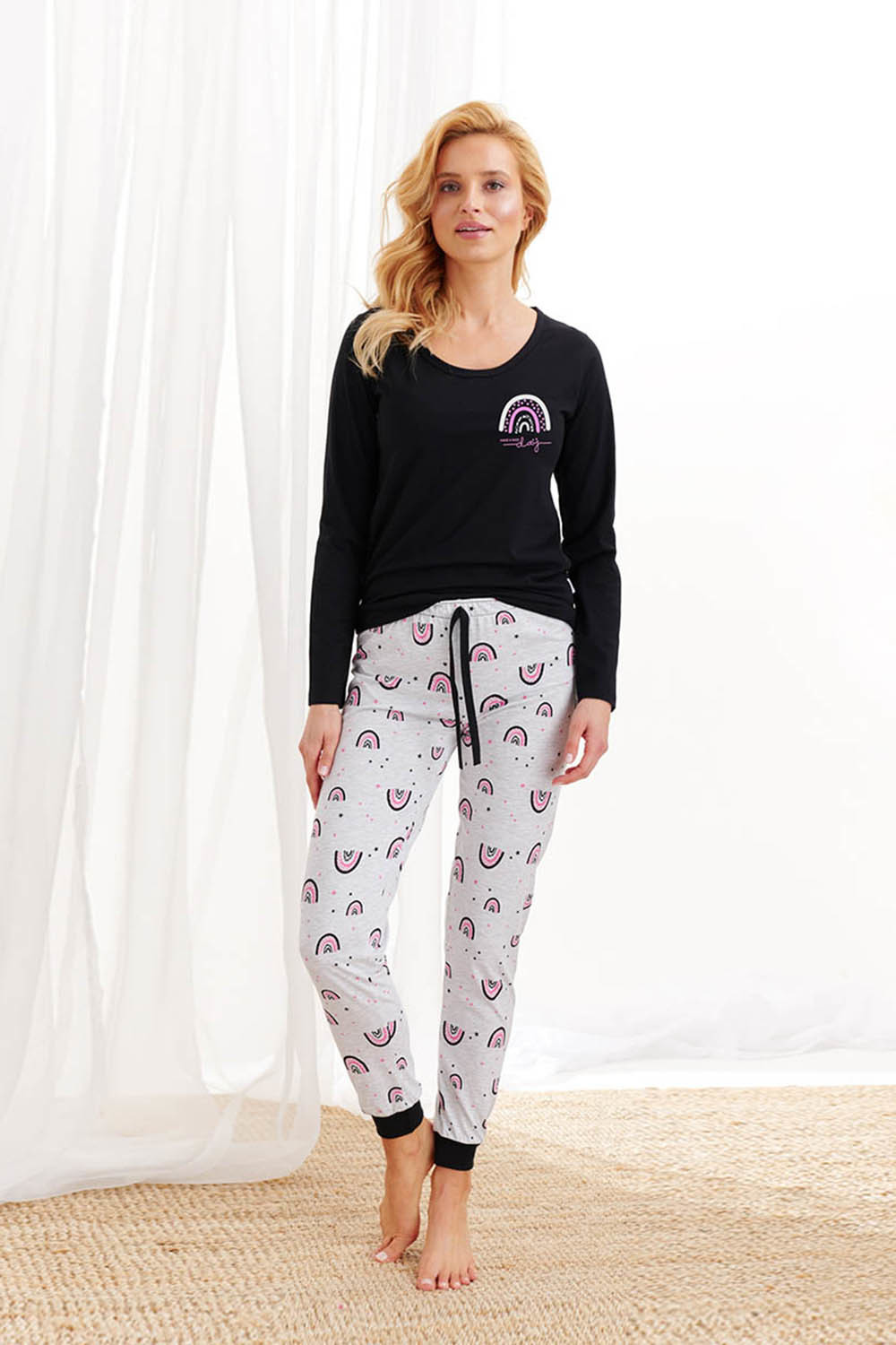 Хлопковая пижама Nora состоит из лонгслива и брюк. Лонгслив свободного кроя, с длинными рукавами, круглым вырезом горловины. Брюки зауженного кроя с манжетой-резинкой по низу. Пижаму украшает забавный принт. Комплект идеально подходит для сна и в качестве домашнего костюма.