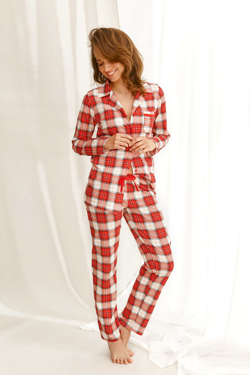 Стильная женская пижама Celine от польского бренда Taro. Пижама выполненная из качественного и мягкого хлопка красного цвета в бежевый клетчатый принт, состоит из рубашки на пуговицах и прямых брюк. Рубашка свободного кроя, с длинными рукавами и отложным воротником, брюки с мягкой резинкой в поясе, по ширине регулируется внутренним шнурком красного цвета. На груди слева рубашка украшена накладным карманчиком с красным кантом. Пижама очень красивая и комфортная, также будет замечательной домашней одеждой и хорошим подарком для любимого или близкого человека.