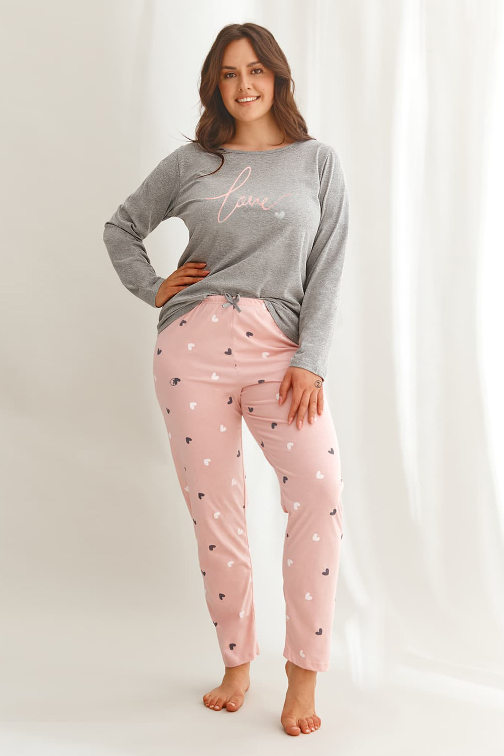Стильная женская пижама Cora от польского бренда Taro. Пижама выполненная из качественного и мягкого хлопка, состоит из серой кофты и розовых брюк с принтом сердечки. Кофта свободного кроя, с длинными рукавами и круглым вырезом горла, брюки с мягкой резинкой в поясе. Пижама очень красивая и комфортная, также будет замечательной домашней одеждой и хорошим подарком для любимого или близкого человека.