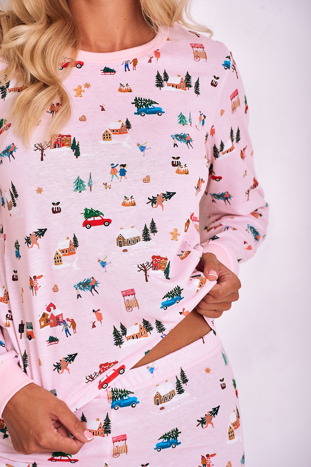 Пижама Laura выполнена из хлопкового полотна, состоит из лонгслива с длинными рукавами и зауженных брюк. Лонгслив свободного кроя с круглым вырезом горловины. Брюки на широкой мягкой резинке. Пижама декорирована рождественским принтом. Идеально подходит для сна и в качестве домашнего костюма.