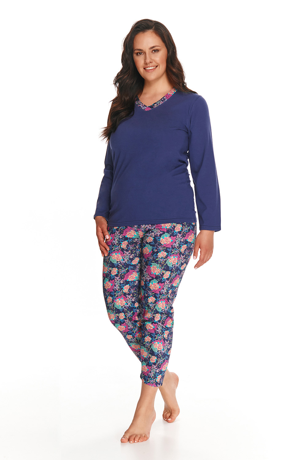 Хлопковая пижама Luna для дам с пышными формами, состоит из кофты и брюк. Кофта с длинным рукавом. Брюки длиной 7/8 на мягкой резинке. Пижама декорирована цветочным принтом, идеально подходит для сна и в качестве домашнего костюма.