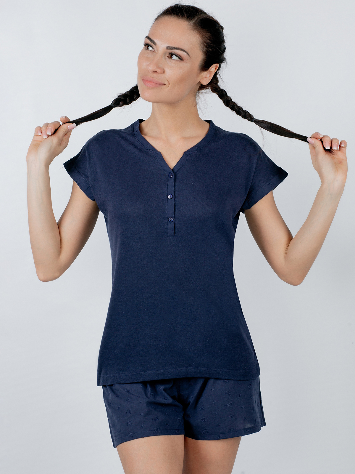 Хлопковая женская пижама, состоящая из однотонной футболки и коротких шортов с цветочной вышивкой. У футболки небольшой рукав и V-образный вырез на пуговицах.