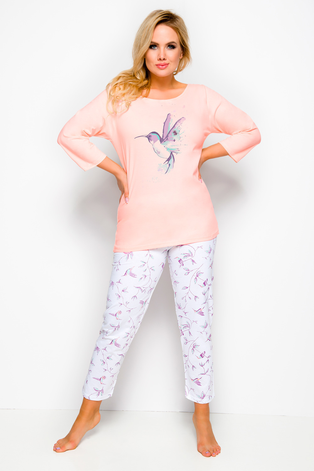 Стильная женская пижама Agnieszka. Комплект состоит из персиковой кофты с рукавом 3/4 и штанов белого цвета с цветочным орнаментом. Отличный вариант для сна и домашнего отдыха.