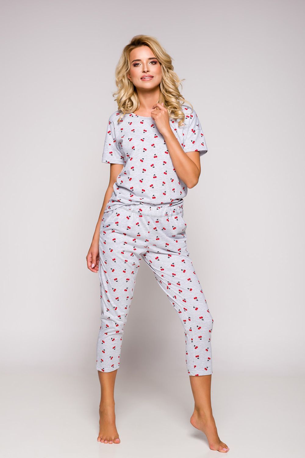Женская пижама Ksara состоит из футболки с коротким рукавом и бридж с карманами. Пижама серого цвета, декорирована принтом "вишенки".