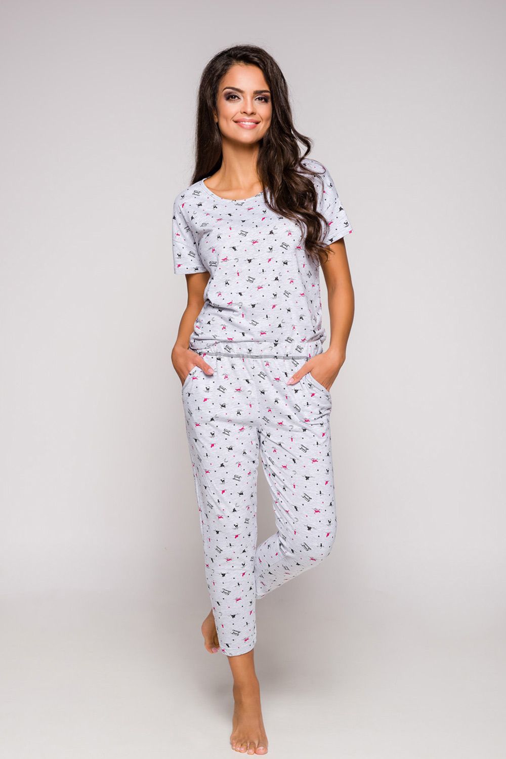 Женская пижама Ksara состоит из футболки с коротким рукавом и бридж с карманами. Пижама серого цвета, декорирована принтом "кошечки".