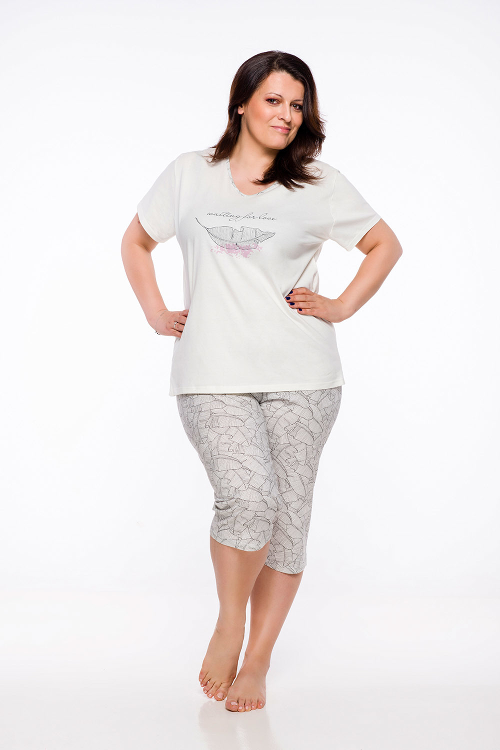 Женская пижама Donata для дам с пышными формами, состоит из футболки и принтованных бридж. Футболка свободного кроя, с коротким рукавом и круглым вырезом горловины.