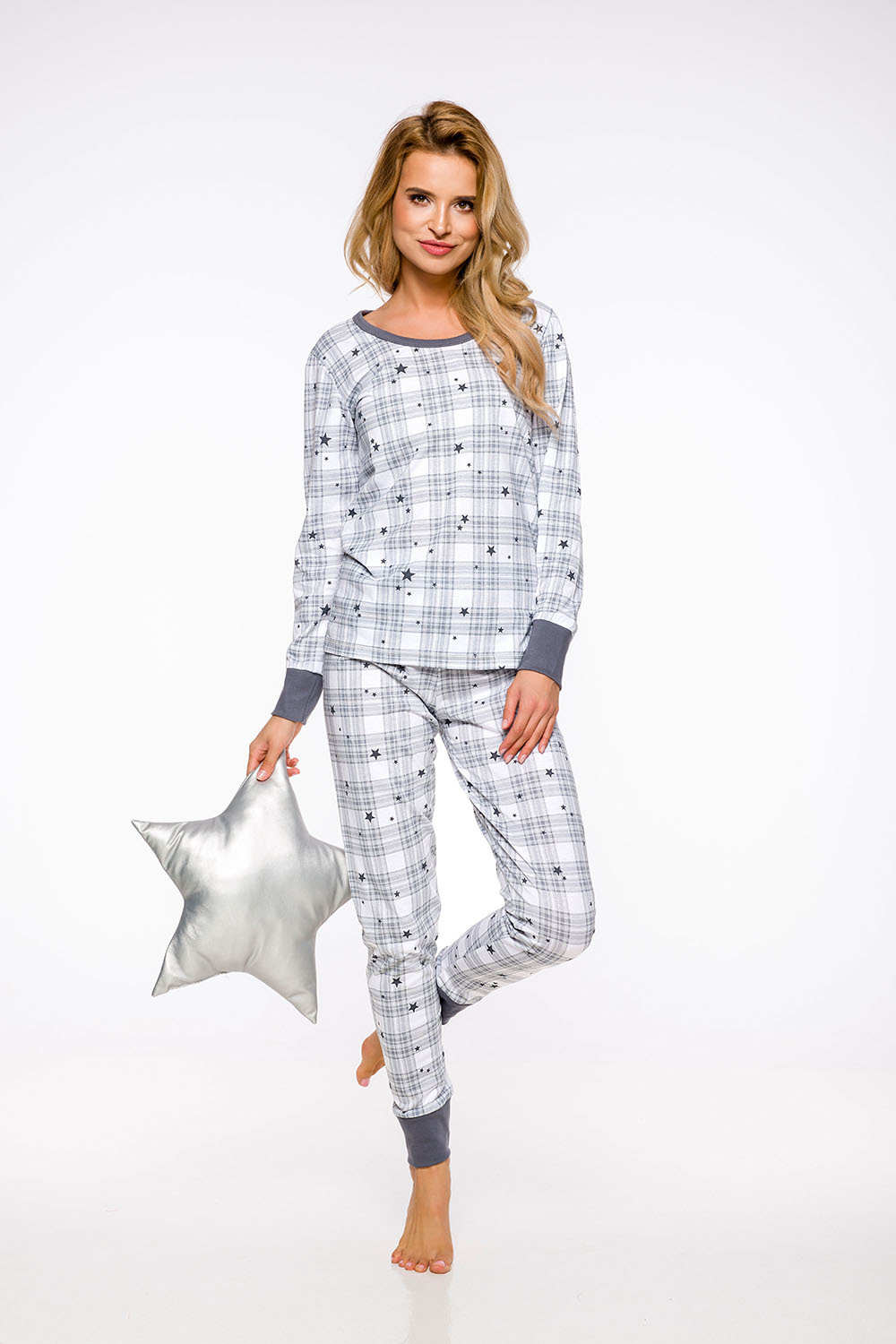 Клетчатая пижама Koko состоит из лонгслива и брюк. Лонгслив свободного кроя, с длинными рукавами, круглым вырезом горловины. Брюки зауженного кроя с манжетой-резинкой по низу. Комплект идеально подходит для сна и в качестве домашнего костюма.