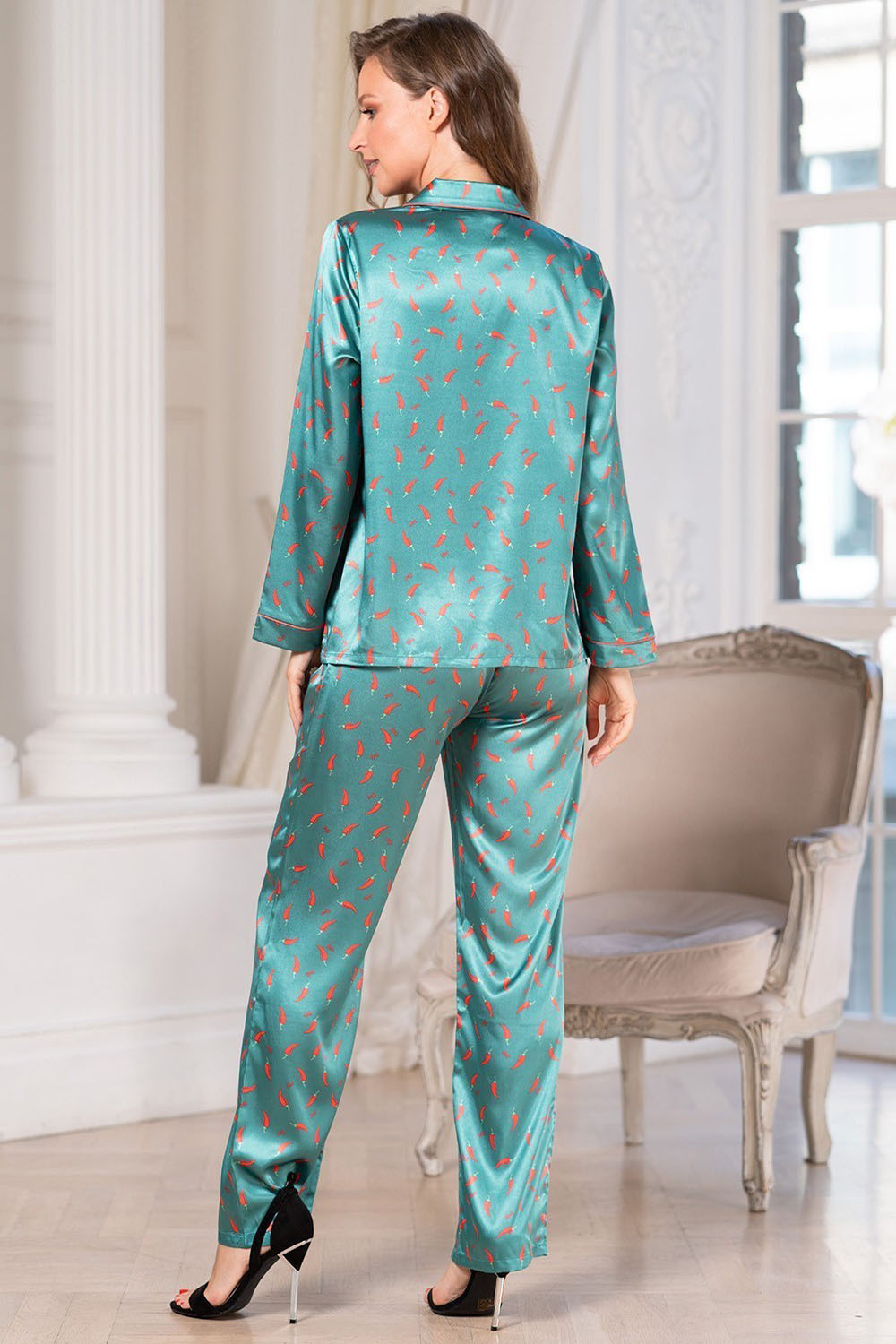 Комплект Mia-Mella состоит из жакета с длинным рукавом, центральной застежкой на пуговицы и брюк. Комплект выполнен из принтованного искусственного шелкового полотна с атласным блеском. Рукава, борт, карманы жакета и низ брюк декорированы контрастным кантом.