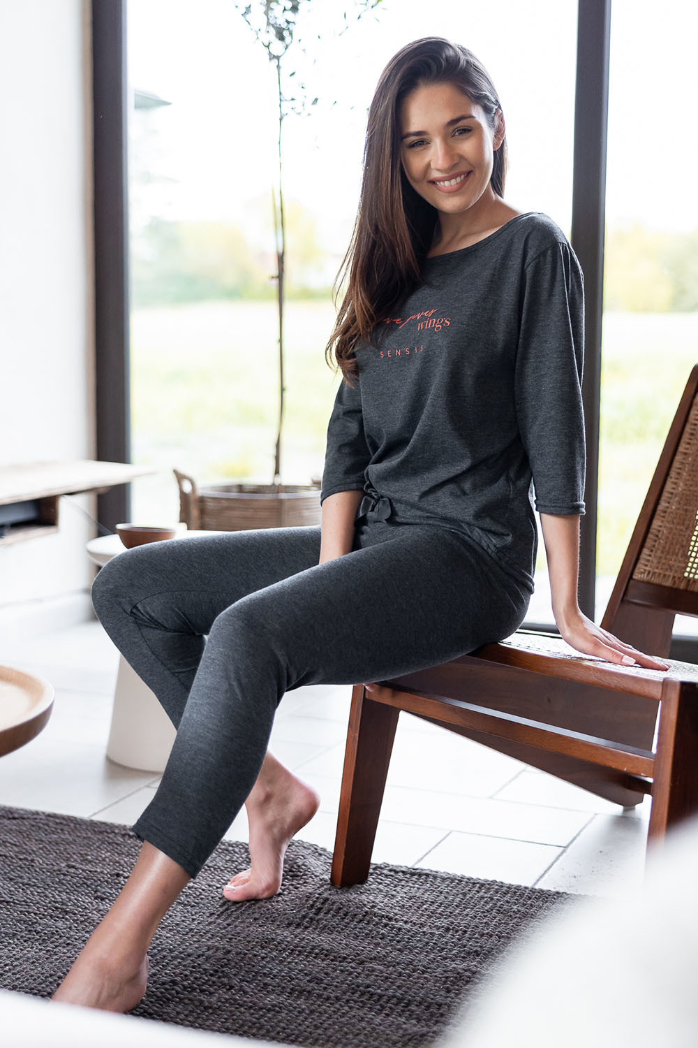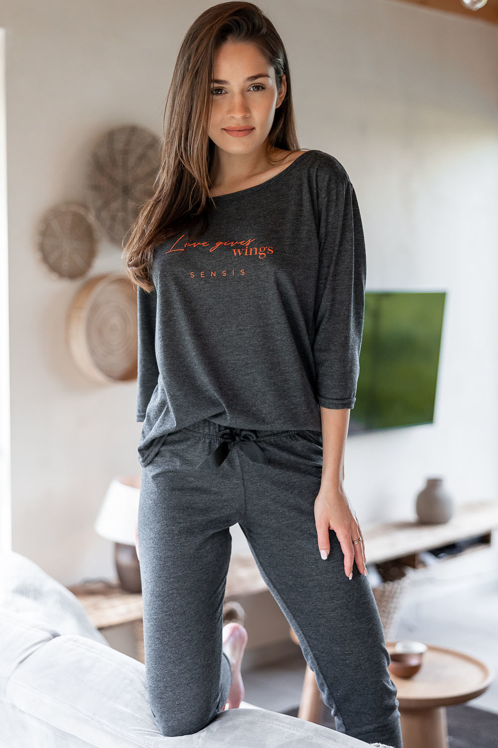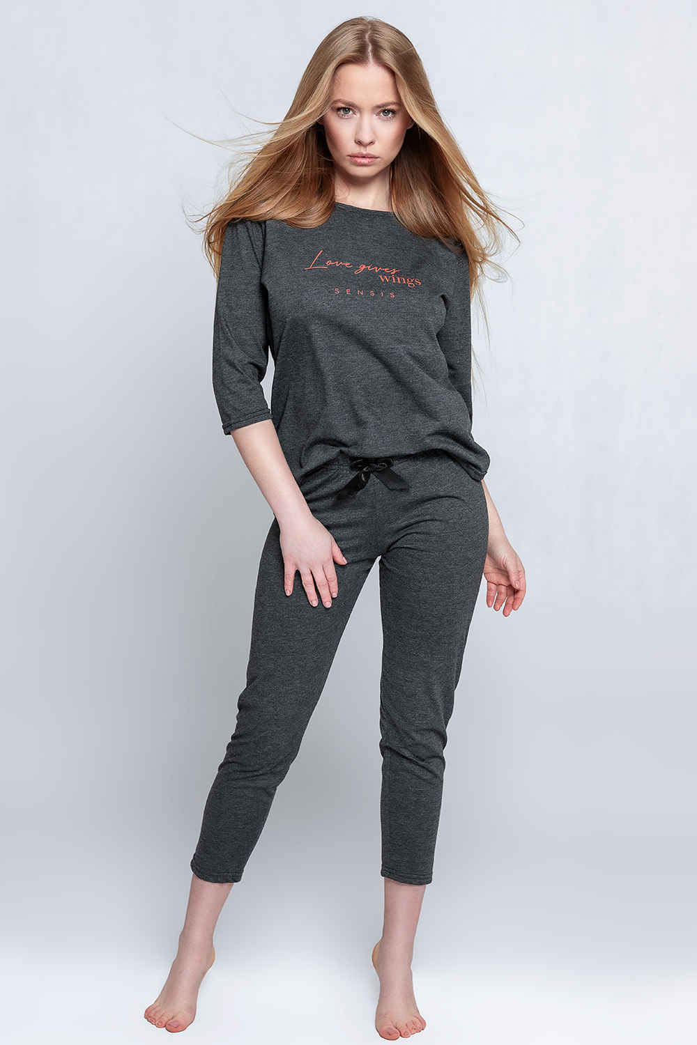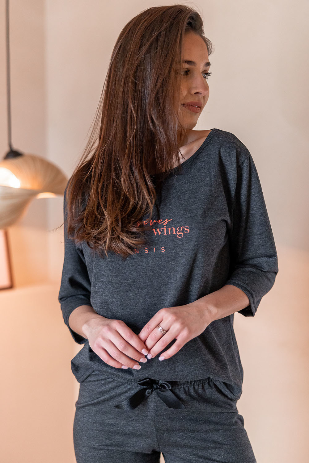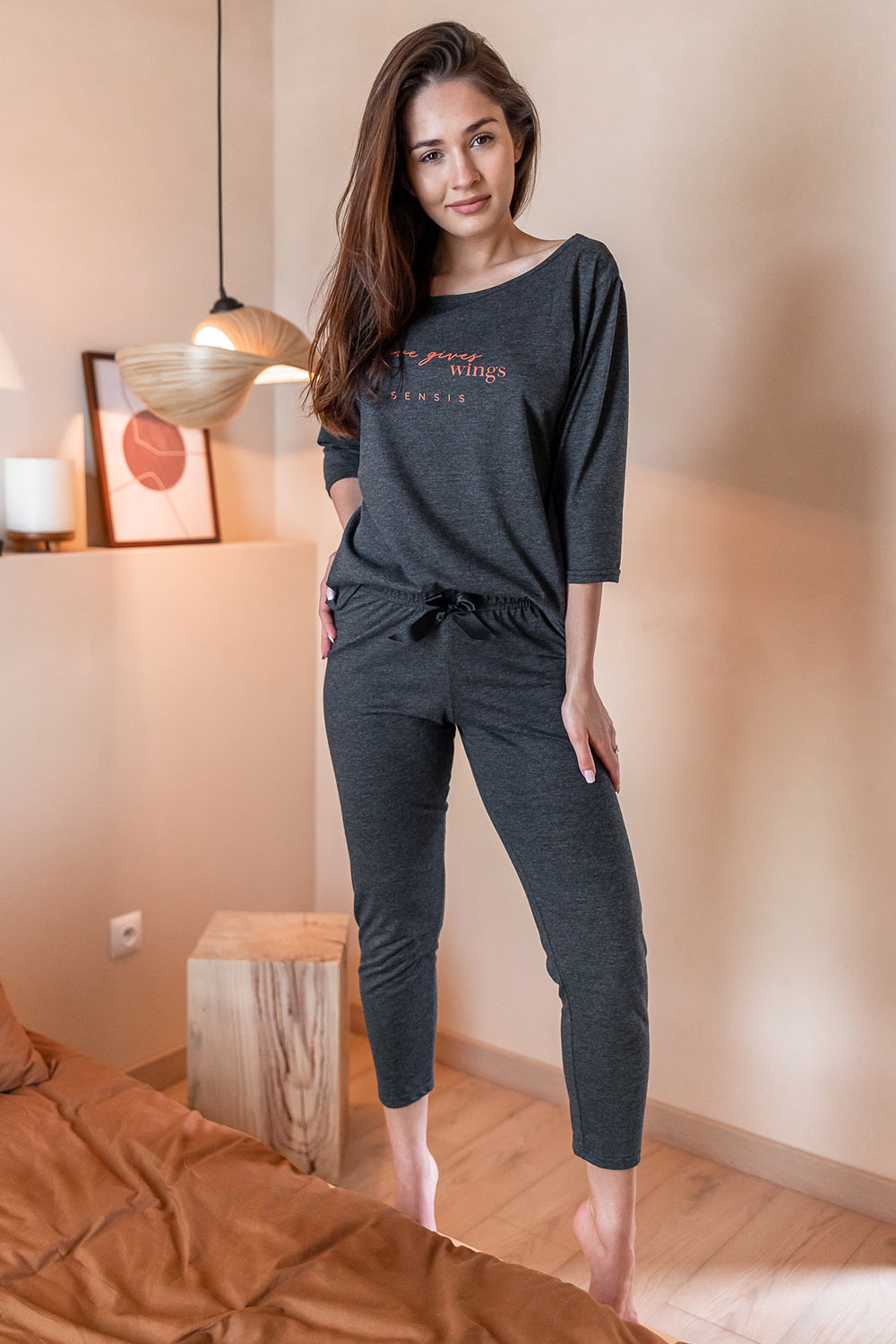 Хлопковая пижама Libre состоит из лонгслива темно-серого цвета и штанов. Лонгслив свободного кроя с рукавами 3/4 и круглым вырезом горловины, декорирован принтом в виде надписи. Штаны, зауженные к низу, пояс на мягкой широкой резинке, украшены атласным бантиком. Идеальный вариант не только для сна, но и для домашнего отдыха.