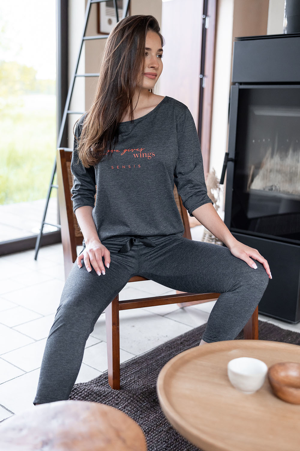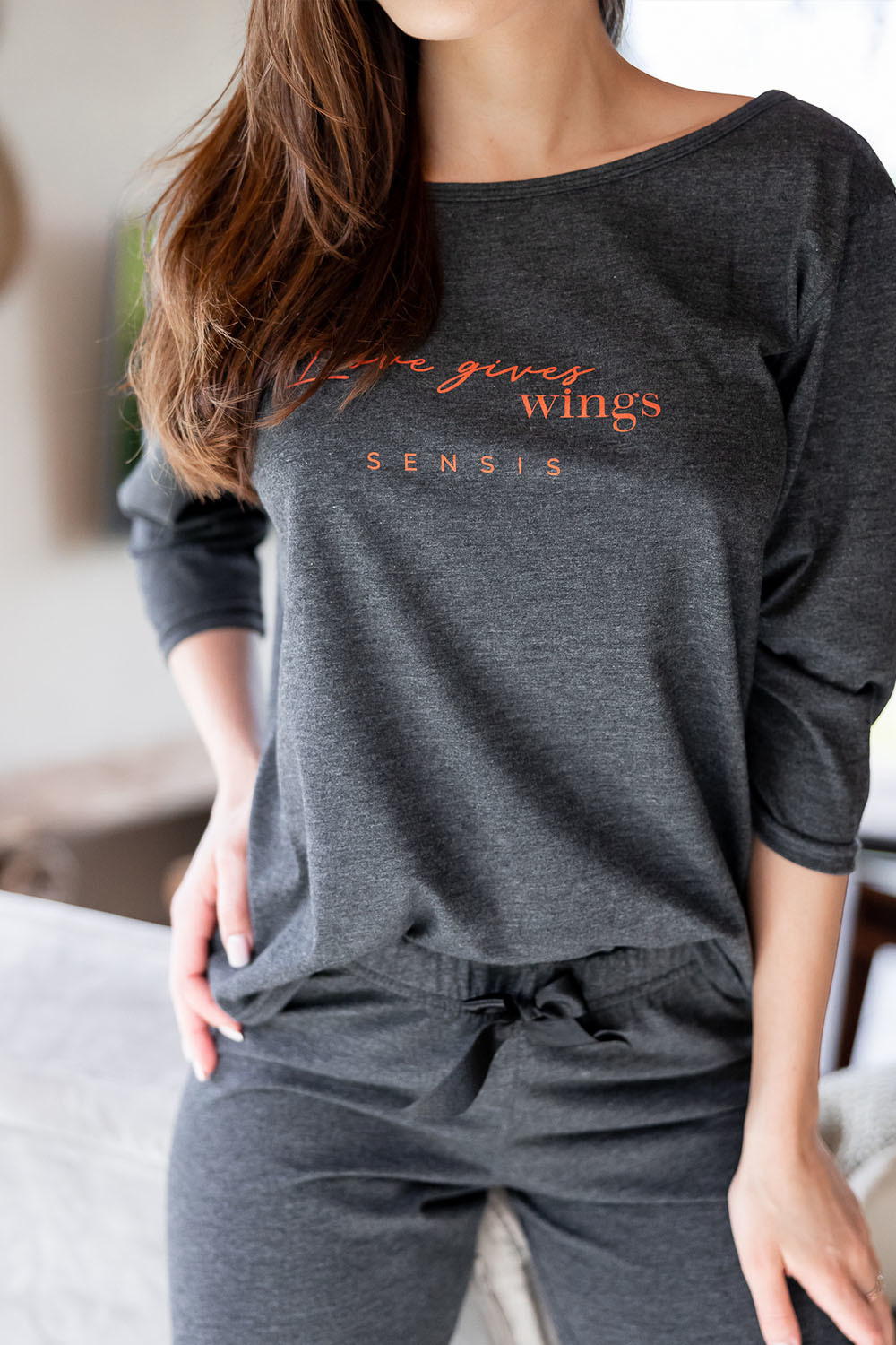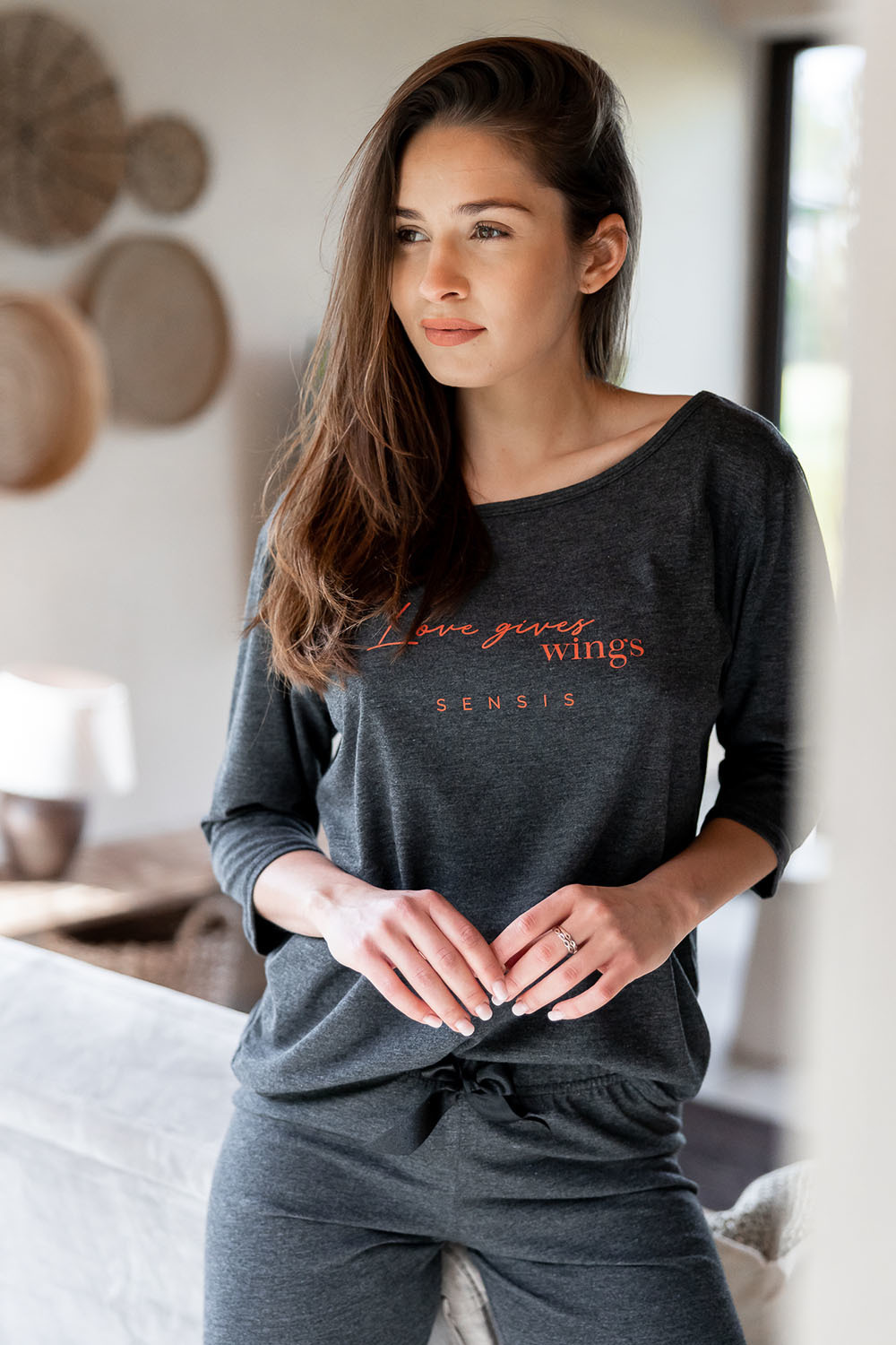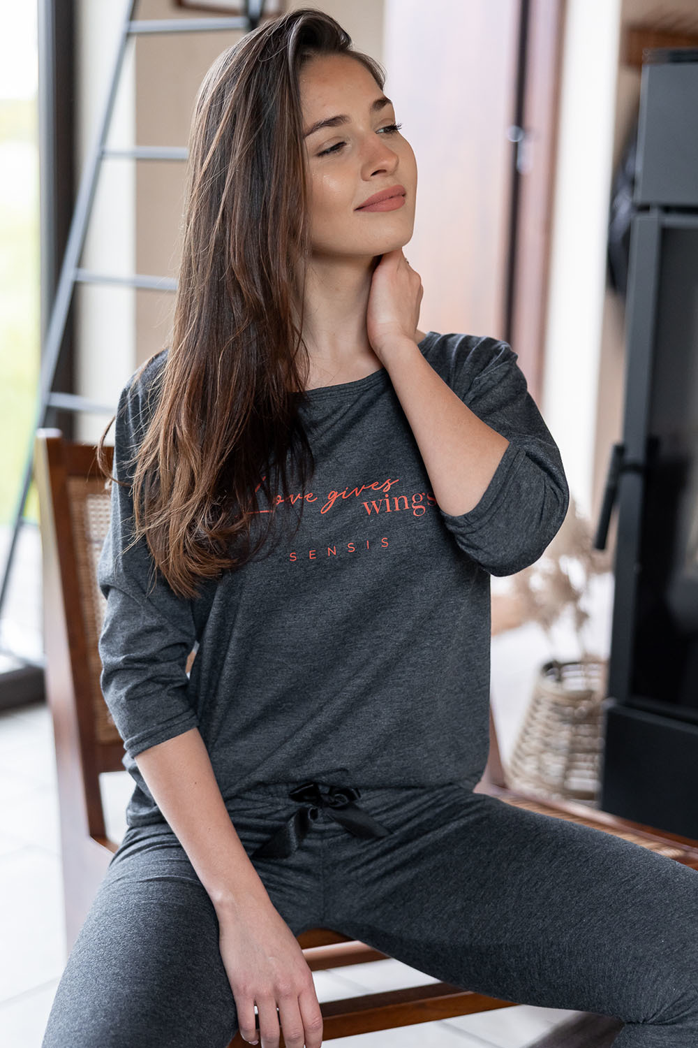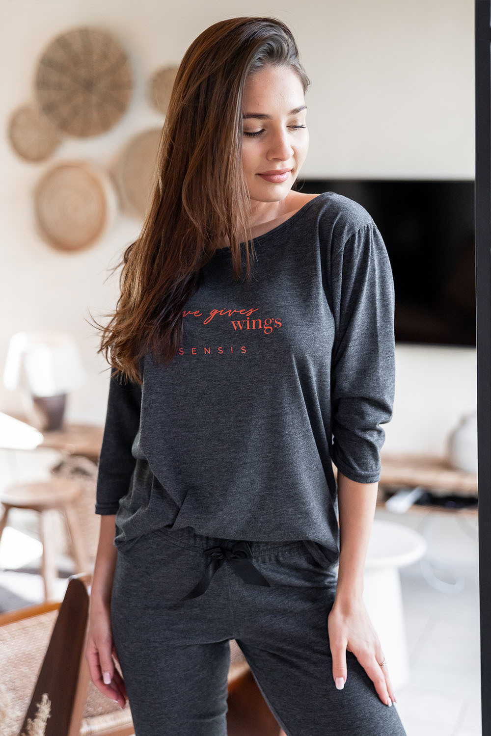 Хлопковая пижама Libre состоит из лонгслива темно-серого цвета и штанов. Лонгслив свободного кроя с рукавами 3/4 и круглым вырезом горловины, декорирован принтом в виде надписи. Штаны, зауженные к низу, пояс на мягкой широкой резинке, украшены атласным бантиком. Идеальный вариант не только для сна, но и для домашнего отдыха.