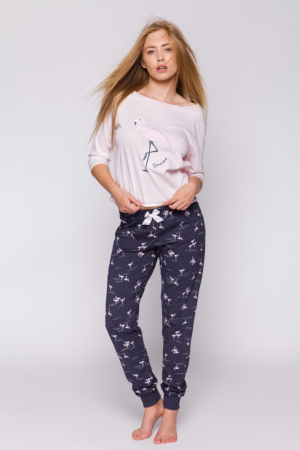 Молодежная пижама Pink Flaming состоит из светло-розовой кофты свободного кроя и синих штанов с манжетой-резинкой по низу. Пижама декорирована принтом "розовый фламинго"