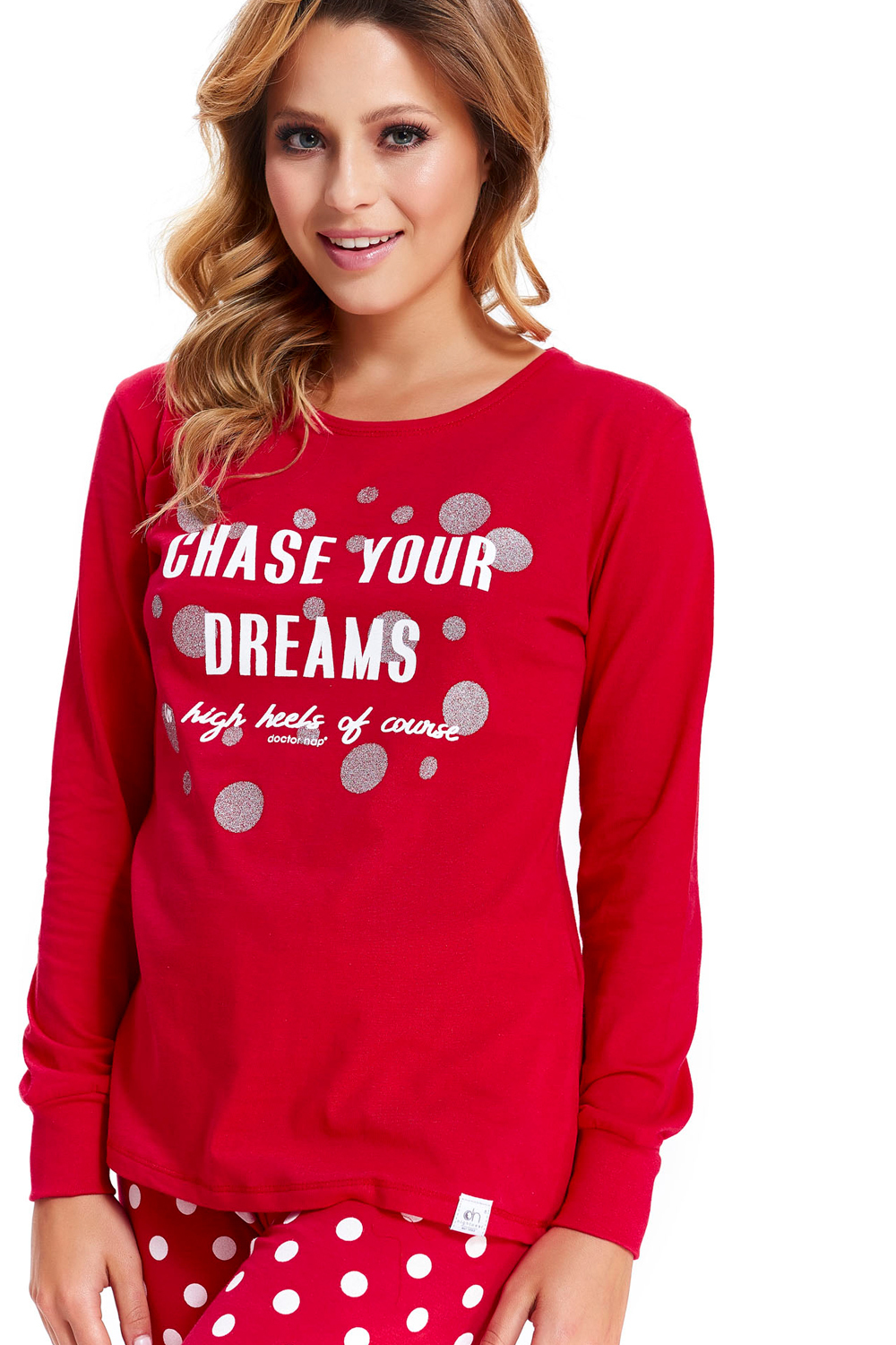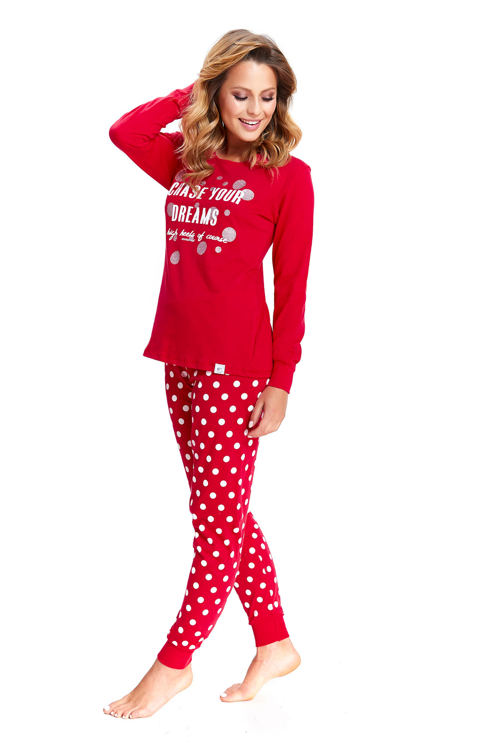 Молодежная хлопковая пижама PM.9507 Red состоит из кофты свободного кроя и штанов с манжетой-резинкой по низу. Кофта красного цвета с принтом в виде надписи, штаны красного цвета в белый горох.