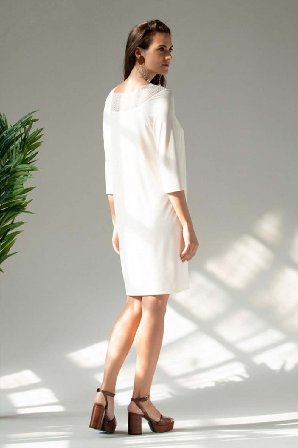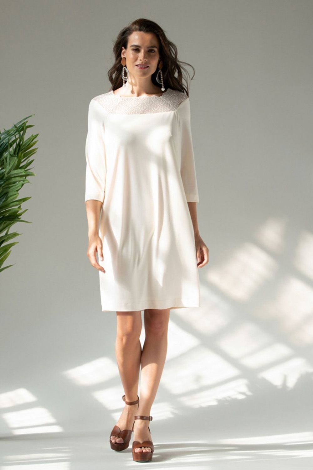 Женственное платье выполнено из легкой, эластичной ткани кремового цвета. Модель c рукавами длиной 3/4, средней длины чуть выше колена, классического, прямого кроя. Красивый, округлый вырез горловины, украшенный изысканной кружевной вставкой, привлекает взгляд к области декольте и подчеркивает красивую шею и плечи. Верхняя часть спинки и плеч также украшена полупрозрачной кружевной вставкой. Красота и изящность классического образа сочетаются в этой прекрасной модели. Нежный кремовый цвет и кружево в тон подчеркнут вашу индивидуальность.