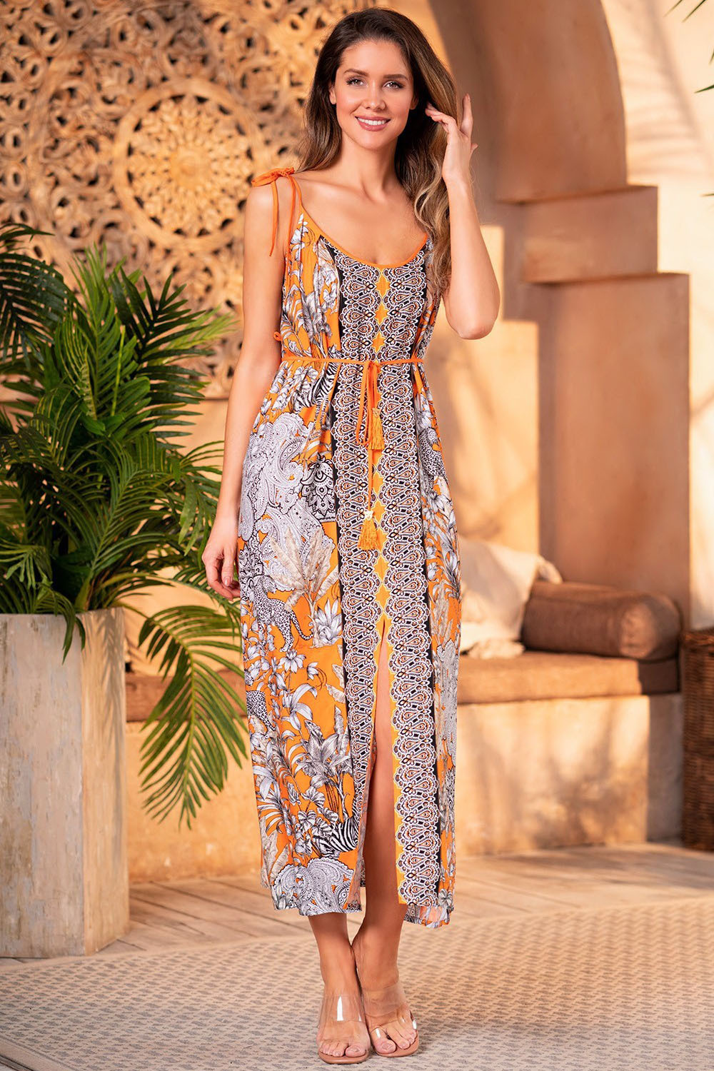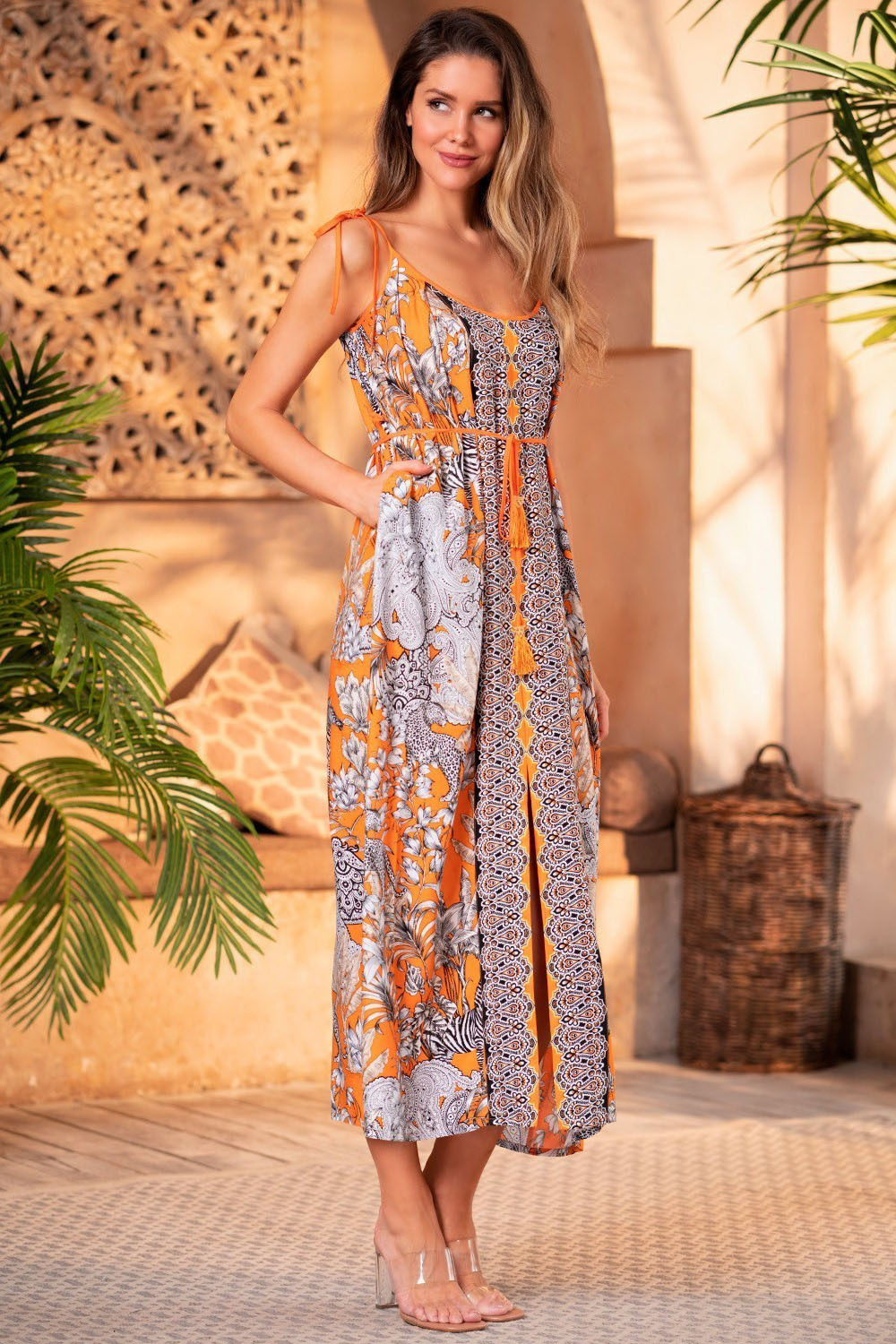 Длинное платье-сарафан Mia-Amore выполнено из принтованной вискозы. Тонкие бретели украшены золотым декором в виде гепардов. Спереди разрез и центральный вертикальный декор эффектно удлиняют силуэт.