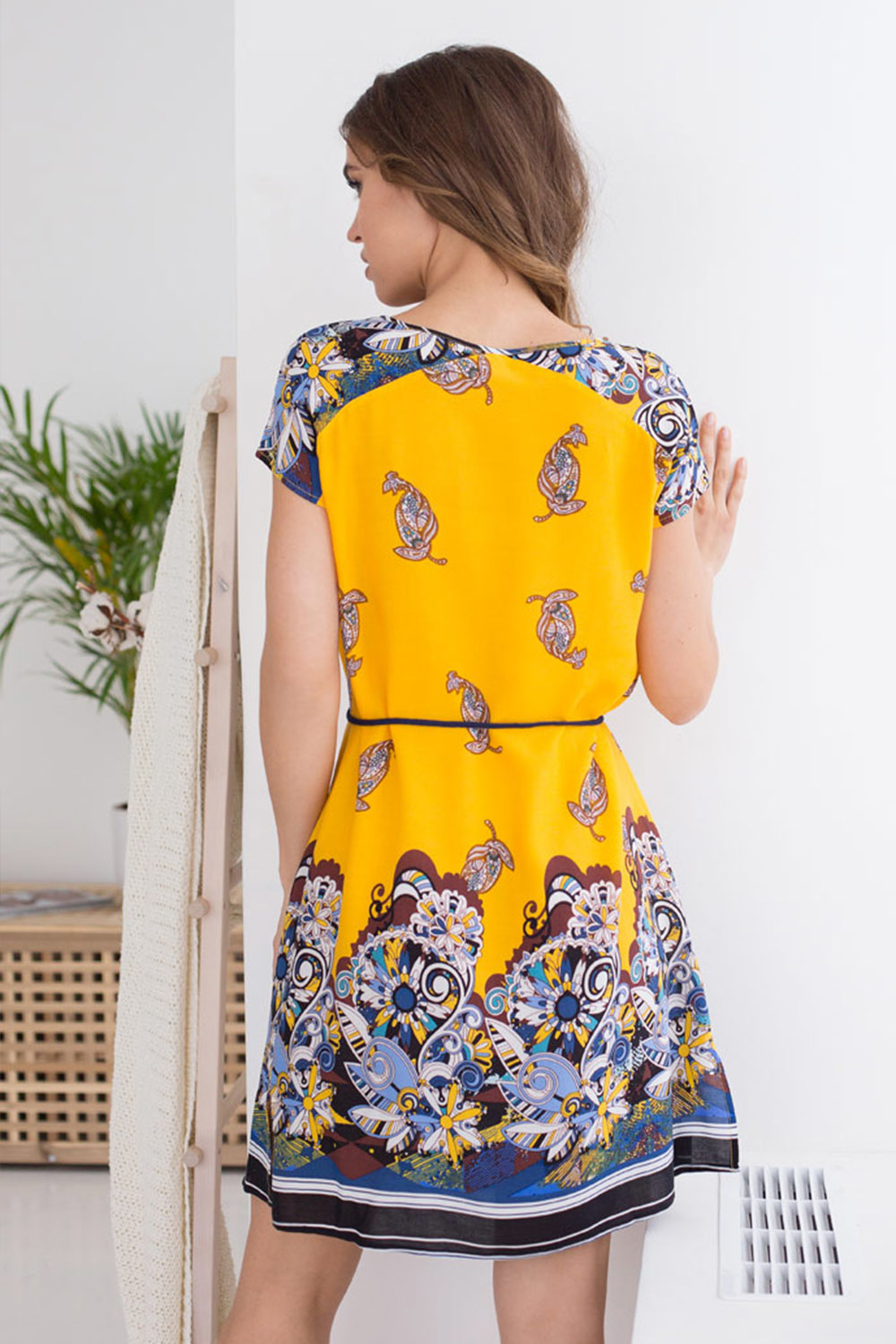 Платье Mia-Mia свободного силуэта из принтованной вискозы на поясе. Длина чуть выше колена. Рукав короткий, цельнокроеный из контрастной части ткани. Разрезы по боковым швам.