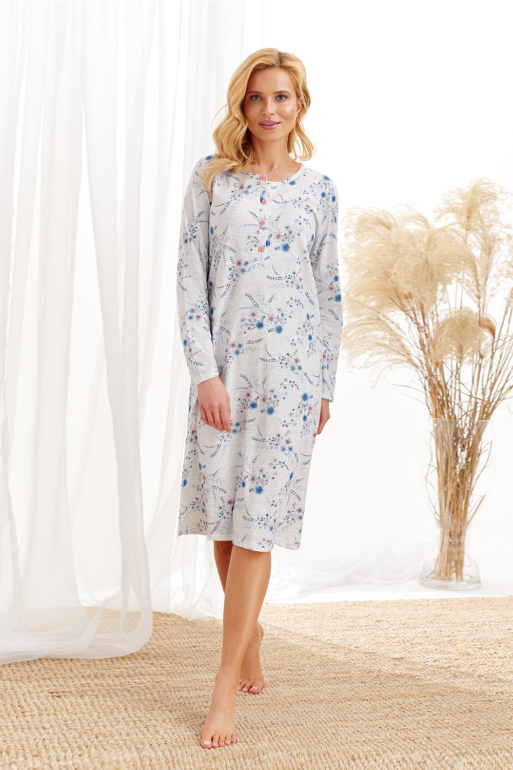 Сорочка Lucja выполнена из хлопкового принтованного полотна высшего качества. Изделие свободного кроя, с длинными рукавами, круглым вырезом горловины и планкой на кнопках. Сорочка идеально подходит для сна и в качестве домашнего платья.
